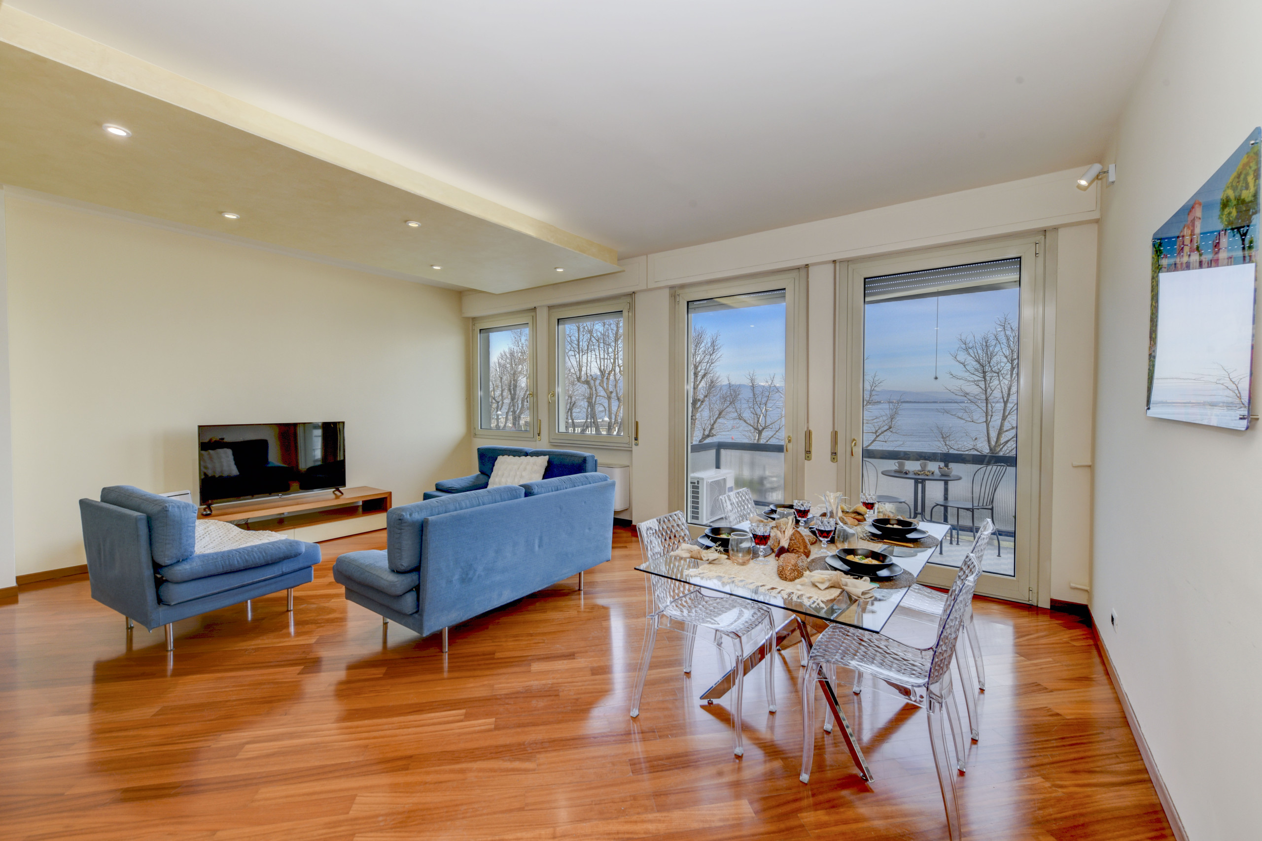 Charming on the Lake is an apartment that embodies elegance and tranquillity, located on the first floor with a lift in an exclusive and private residential context. The entrance of the apartment leads directly to a spacious living room that harmonises the dining area and relaxation zone, enriched by large windows offering a spectacular view of the lake. Every detail is designed to create a welcoming atmosphere, but it is the breathtaking view that truly conquers those who enter: the balcony, accessible from both the living room and the kitchen, is the ideal place to enjoy an outdoor breakfast or to be fascinated by the warm colours of the sunset reflecting on the water, creating a unique and unforgettable experience.