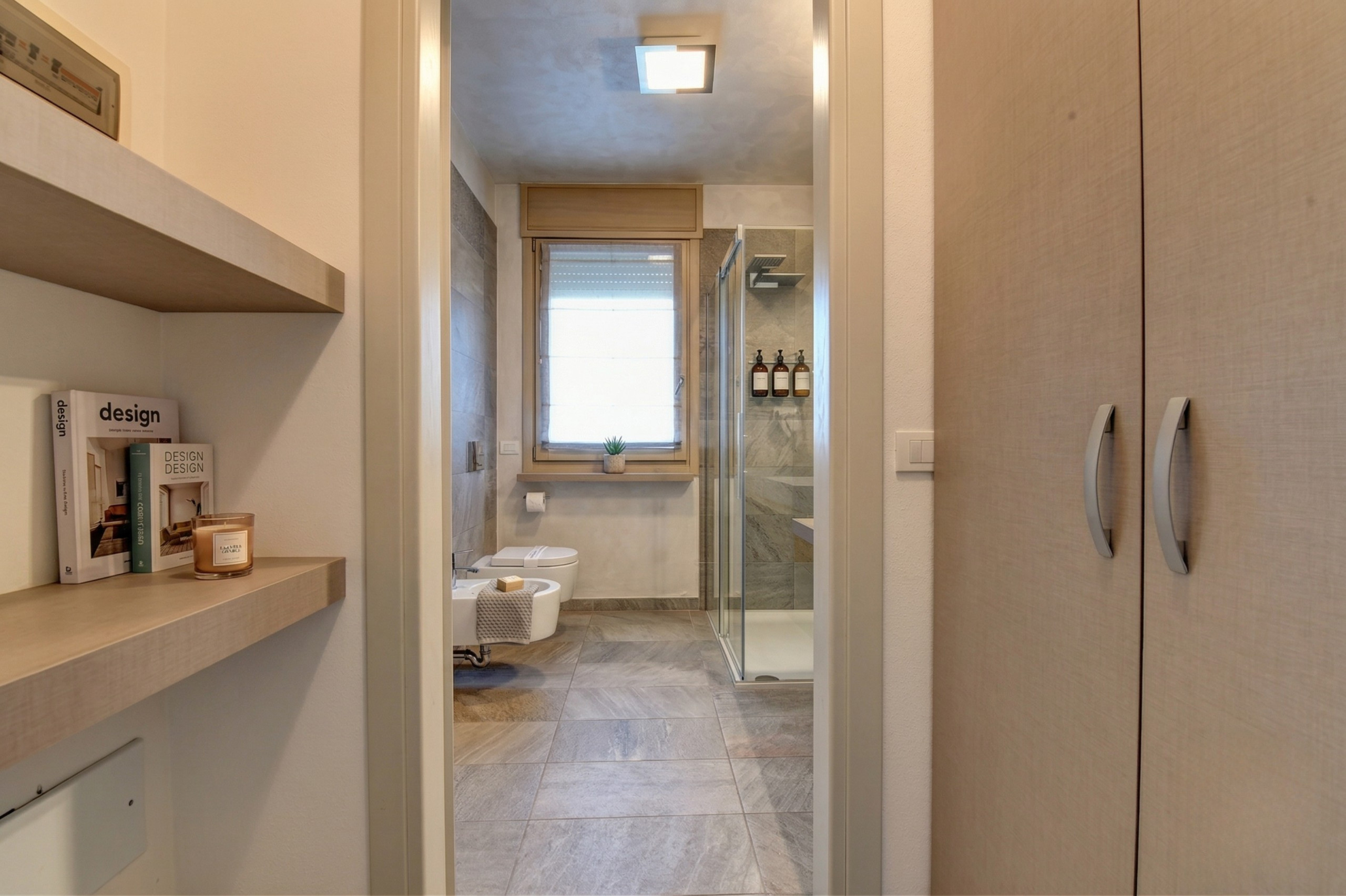 The apartment stands out for the elegance and functionality of its spaces. Upon entering, a spacious and bright living room welcomes you, furnished with taste and equipped with all comforts: air conditioning, a Smart TV, and a comfortable sofa, perfect for moments of relaxation or an evening with company. The living area directly connects to the American-style kitchen, separated by a refined sliding glass door, making it perfect to be lived in an open and bright manner. The kitchen is spacious, complete with a peninsula and equipped with every necessary accessory to prepare delicious dishes or aperitifs. From the kitchen and living room, three large French windows lead to the spacious 48 sqm terrace, offering a panoramic view of the lake. This outdoor space is a slice of paradise, with a large table, chairs, and a comfortable sofa, ideal for outdoor lunches or moments of relaxation. In the evening, the atmosphere becomes even more evocative thanks to the discreet lighting of the spotlights, creating a perfect setting to enjoy the view and tranquillity.