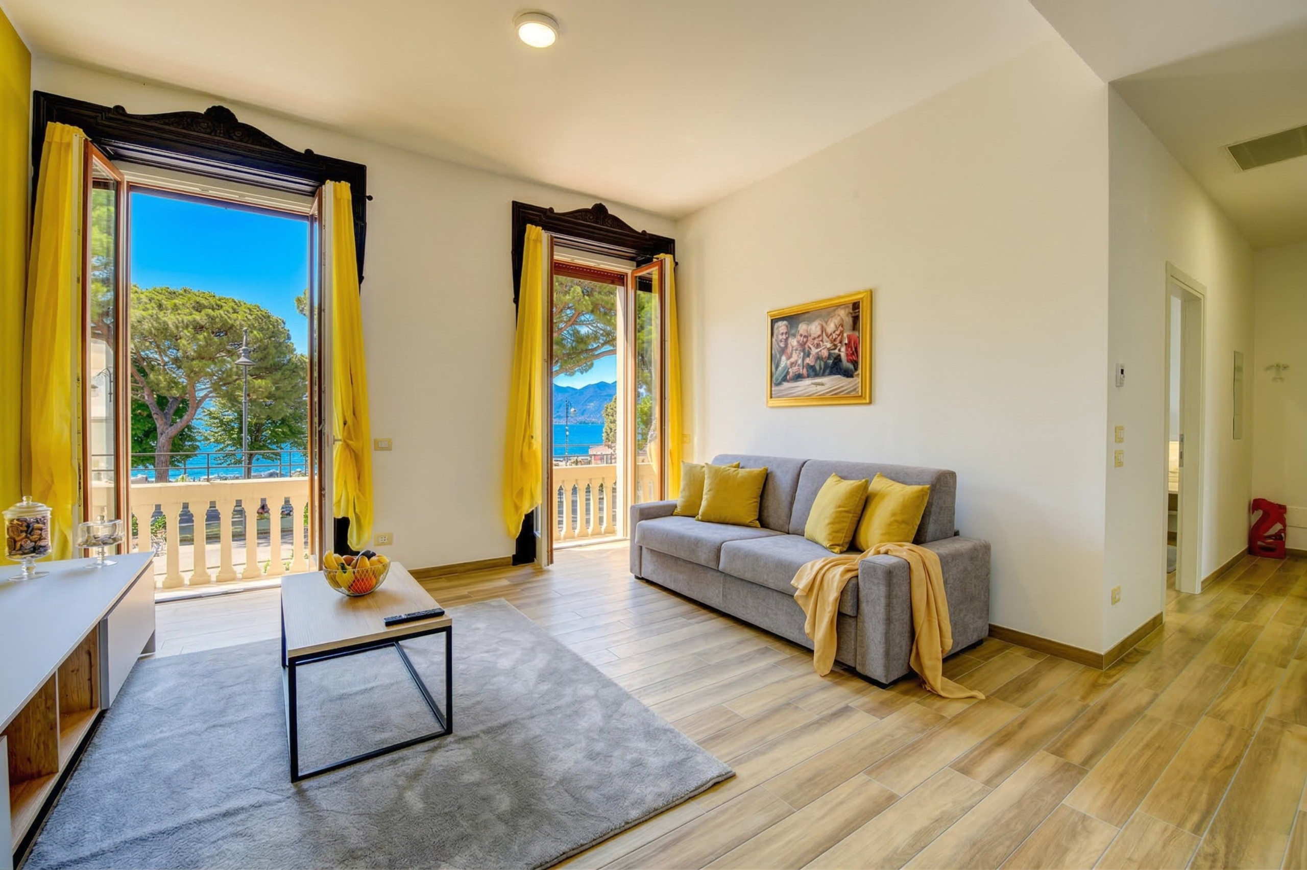 The apartment entrance welcomes you into a bright and spacious living area, where functionality meets style. The living room is furnished with a comfortable double sofa bed, perfect for a moment of relaxation after an exploratory day on the lake or in nearby cities. The area is equipped with a flat-screen TV unit, a table with chairs for convivial meals, and a fully equipped kitchen, ideal for those who love to prepare their own dishes. You will find a hob, refrigerator with freezer, microwave, toaster and all the necessary utensils to cook with simplicity and taste.