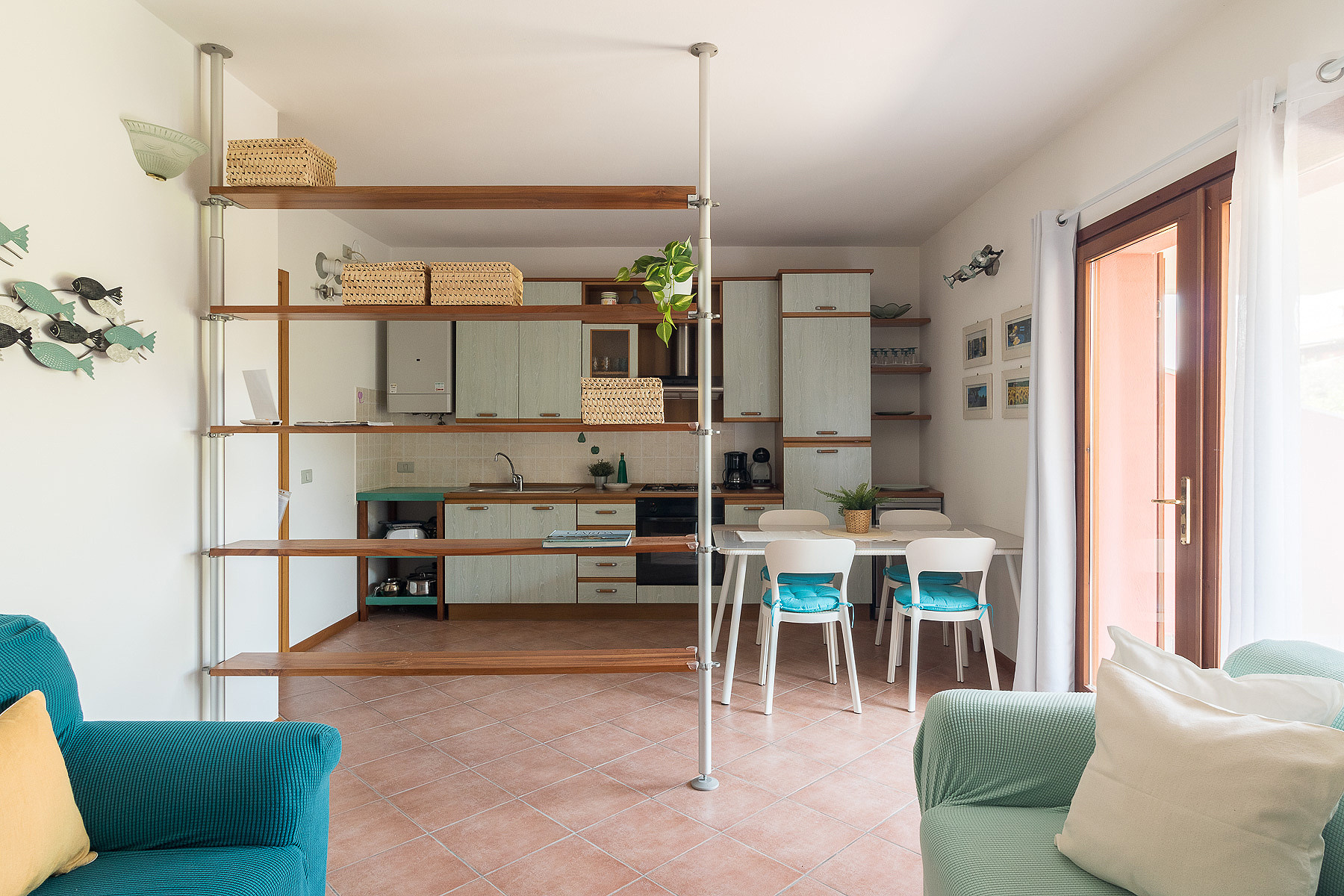 Bright living room with double sofa bed, two armchairs, Smart TV, dining table, and fully equipped kitchen (including Nescafè Dolce Gusto coffee machine)