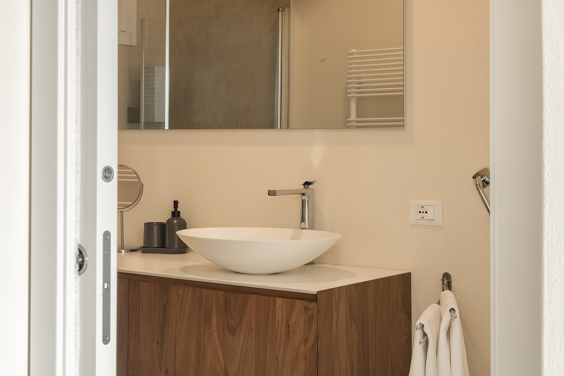 Between the apartment and the lake, there is a large shared green area, perfect for relaxing outdoors, sunbathing, or letting children play safely.
