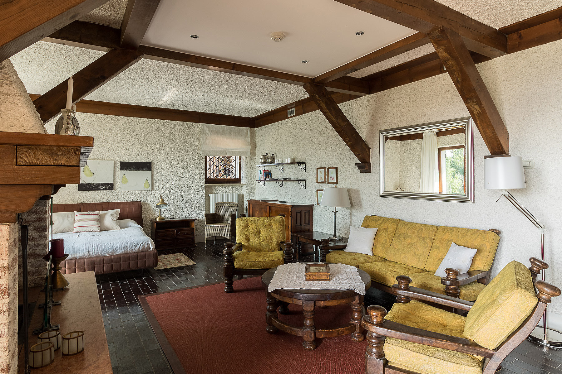 Moving down to the basement level, you will discover a spacious open plan area with a double bed and a second bathroom, offering an additional living area and privacy for guests. The warm-toned decor offers a classic and welcoming charm.