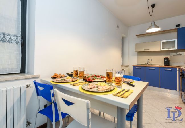 L'ingresso dell'appartamento ti accoglie in una luminosa e spaziosa zona giorno, dove la funzionalità si unisce allo stile. Il soggiorno è arredato con un comodo divano letto matrimoniale, perfetto per un momento di relax dopo una giornata esplorativa sul lago o nelle vicine città. La zona è dotata di un mobile TV a schermo piatto, un tavolo con sedie per pasti conviviali, e una cucina completamente attrezzata, ideale per chi ama preparare i propri piatti. Troverai un piano cottura, frigorifero con congelatore, microonde, tostapane e tutti gli utensili necessari per cucinare con semplicità e gusto.