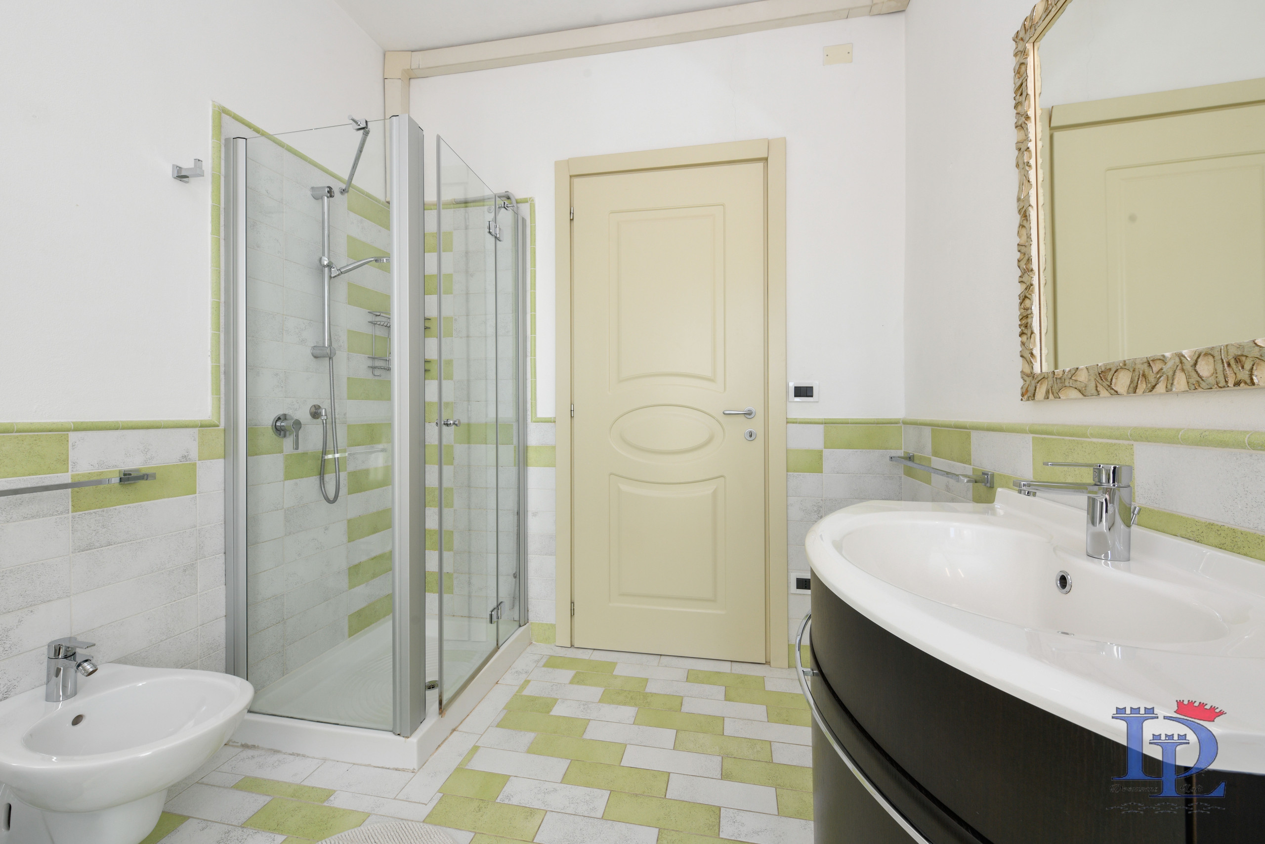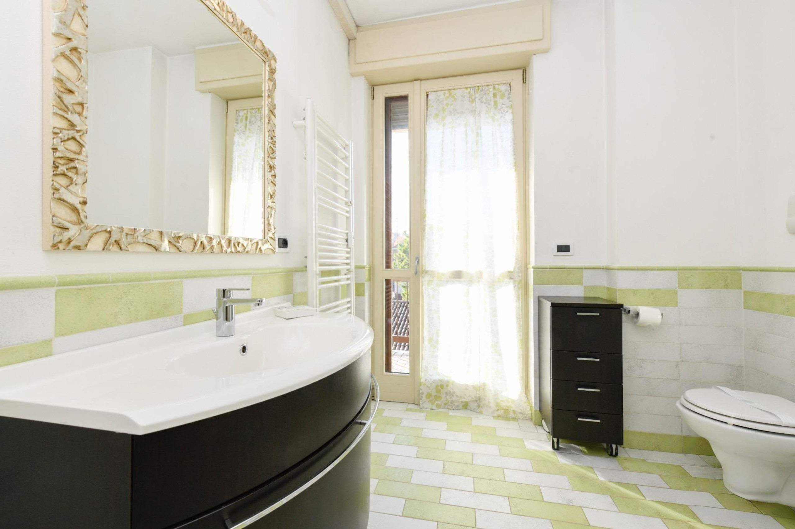 Proseguendo lungo il corridoio, si incontra il bagno, un ambiente moderno e luminoso, rivestito di piastrelle bianche e verdi. Qui, il grande specchio sopra il lavabo amplifica la sensazione di spazio, mentre la presenza della doccia, del wc e del bidet garantisce ogni comfort. Una portafinestra si apre sul balcone, inondando la stanza di luce naturale e creando un ambiente fresco e arioso.