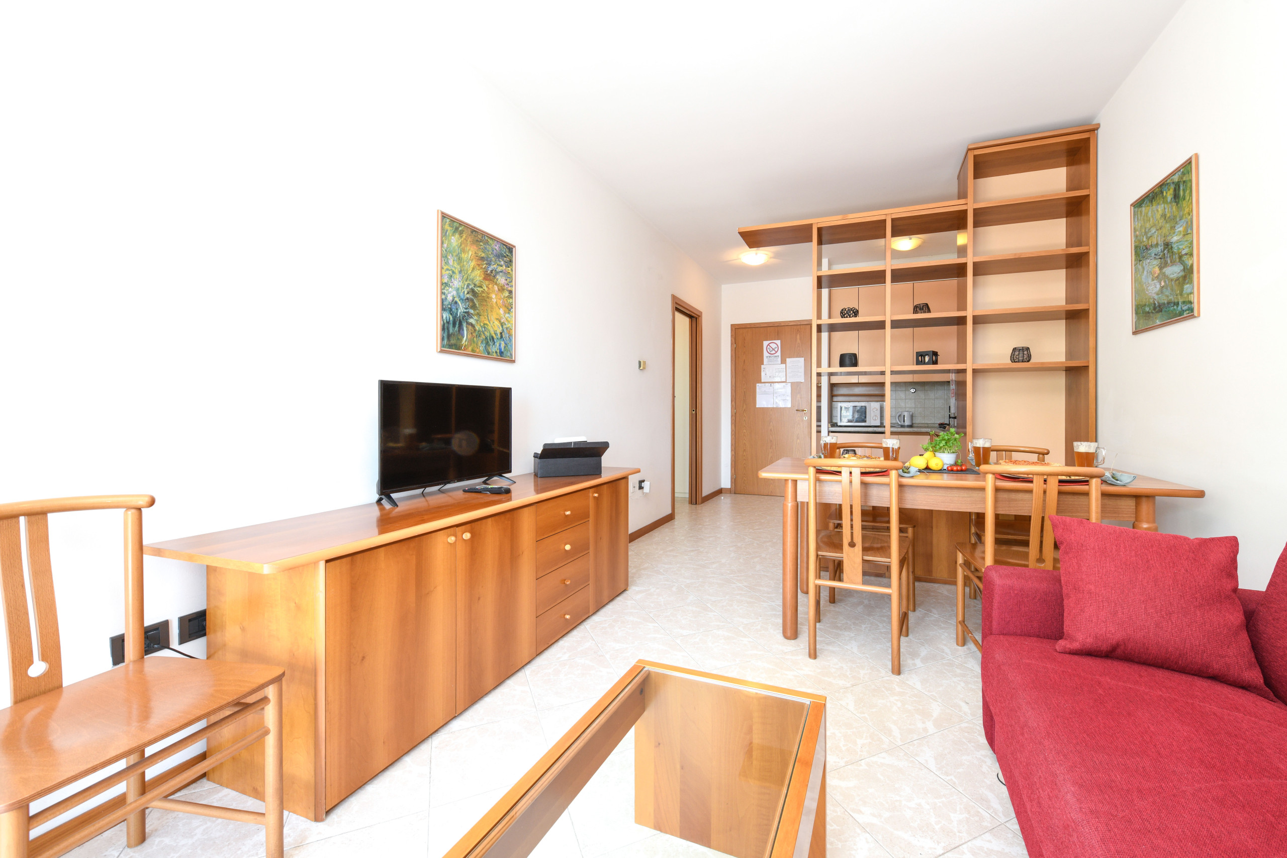 All’interno, l’arredamento classico e funzionale è stato pensato per offrire il massimo comfort. L'angolo cottura è ben attrezzato con frigorifero, piano cottura, microonde e stoviglie, permettendo agli ospiti di preparare facilmente i propri pasti. Il soggiorno, luminoso e spazioso, è arredato con un divano letto matrimoniale, ideale per rilassarsi dopo una giornata di esplorazione. Grazie alla porta finestra, il soggiorno si apre sul terrazzo, inondando l’ambiente di luce naturale.