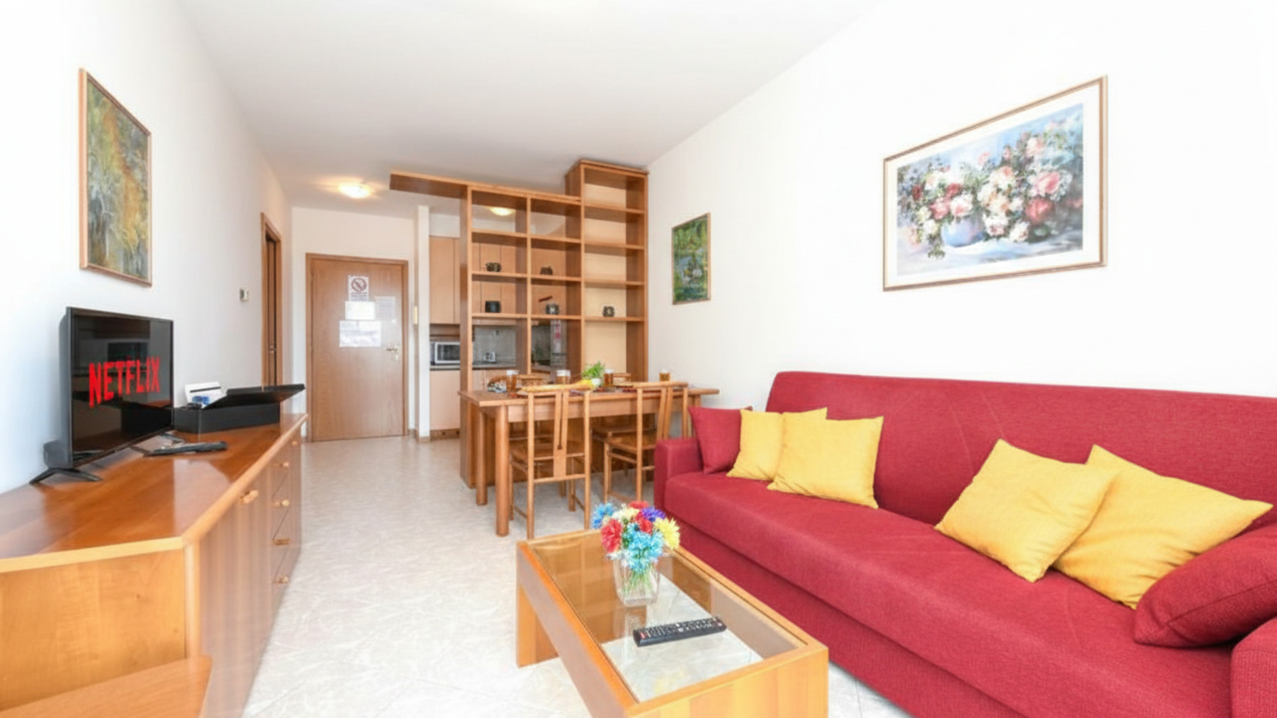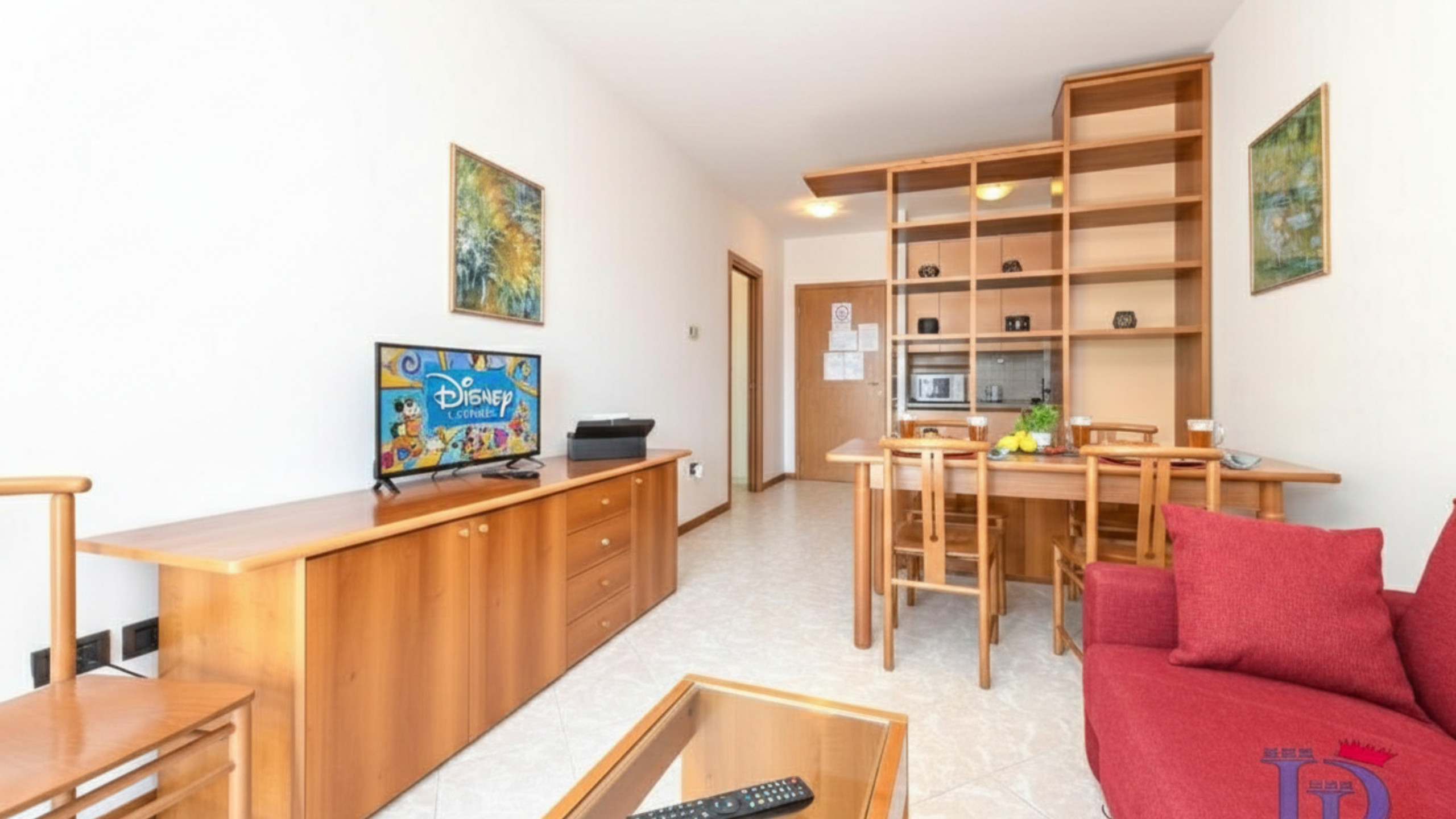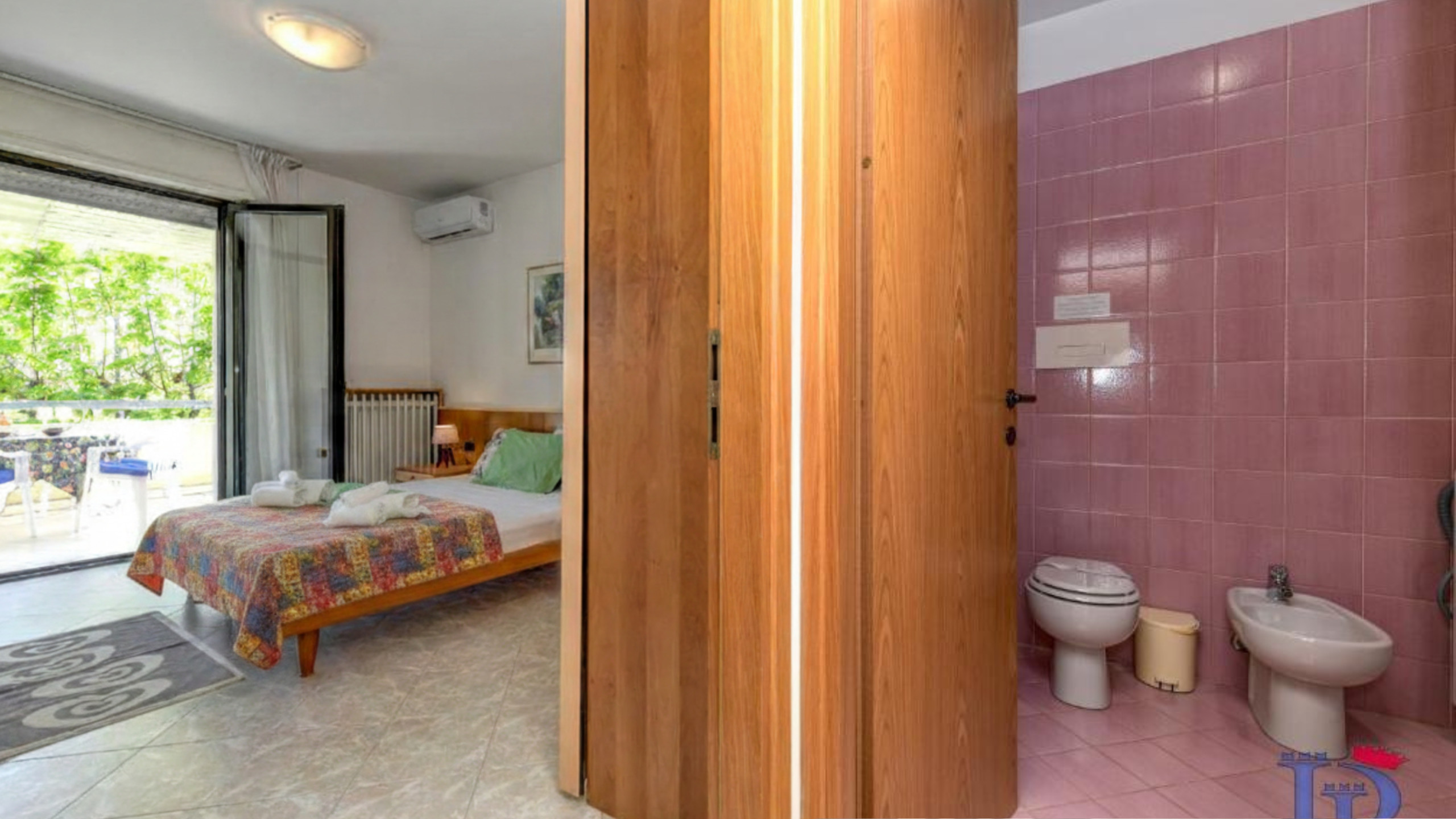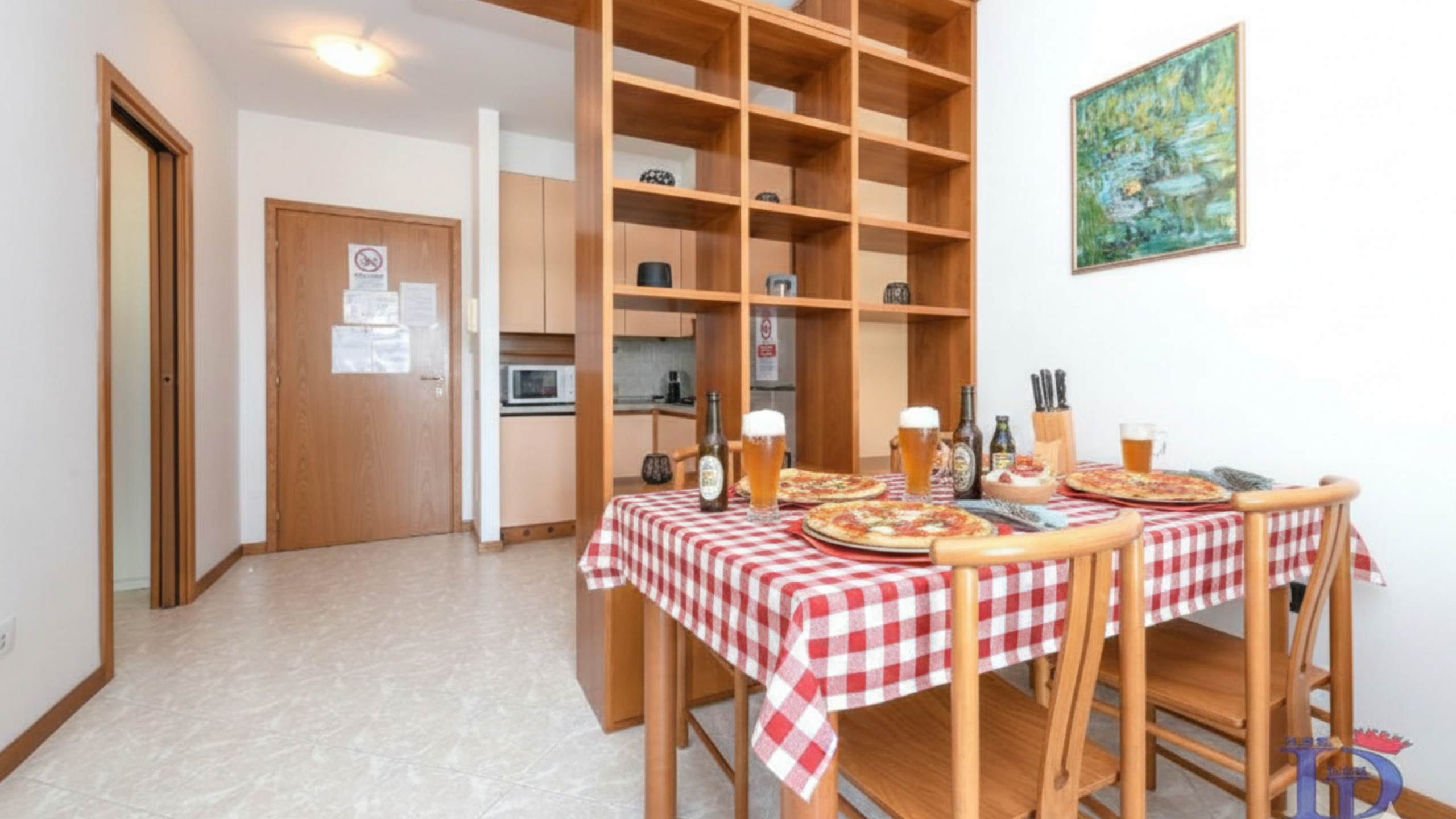 A destra dell’ingresso, un pratico ripostiglio offre accessori utili come stendino, ferro e asse da stiro, garantendo che l’appartamento resti sempre ordinato e funzionale. Il bagno, caratterizzato da toni caldi e rilassanti, è dotato di cabina doccia, wc, bidet, lavatrice e un ampio lavandino con specchio, offrendo tutto il necessario per un soggiorno confortevole.