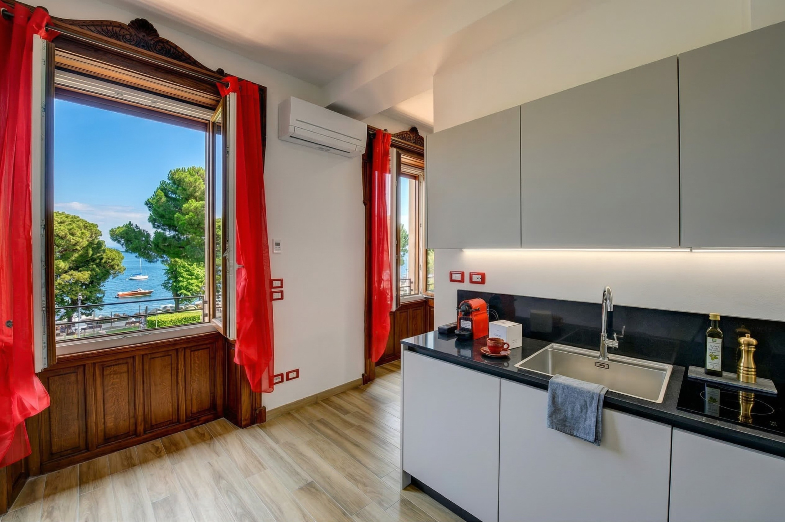 L’appartamento si distingue per l’eleganza e la funzionalità degli spazi. Entrando, ci accoglie un ampio e luminoso salone, arredato con gusto e dotato di tutti i comfort: aria condizionata, una Smart TV e un comodo divano, perfetto per momenti di relax o per una serata in compagnia. La zona living si collega direttamente alla cucina all’americana, separata da una raffinata vetrata scorrevole, che la rende perfetta per essere vissuta in modo aperto e luminoso. La cucina è spaziosa, completa di una penisola e attrezzata con ogni accessorio necessario per preparare piatti gustosi o aperitivi. Dalla cucina e dal salone, tre grandi porte finestre conducono all'ampia terrazza di 48 mq, che offre una vista panoramica sul lago. Questo spazio esterno è un angolo di paradiso, con un grande tavolo, sedie e un comodo divano, ideale per pranzi all’aperto o momenti di relax. Di sera, l’atmosfera diventa ancora più suggestiva grazie all’illuminazione discreta dei faretti, che crea un’ambientazione perfetta per godere della vista e della tranquillità.