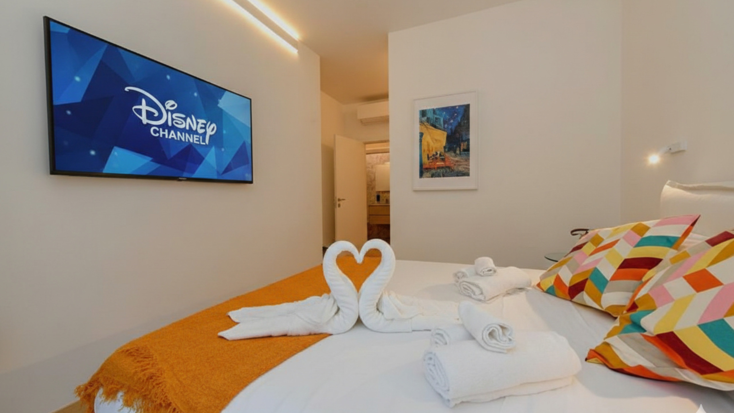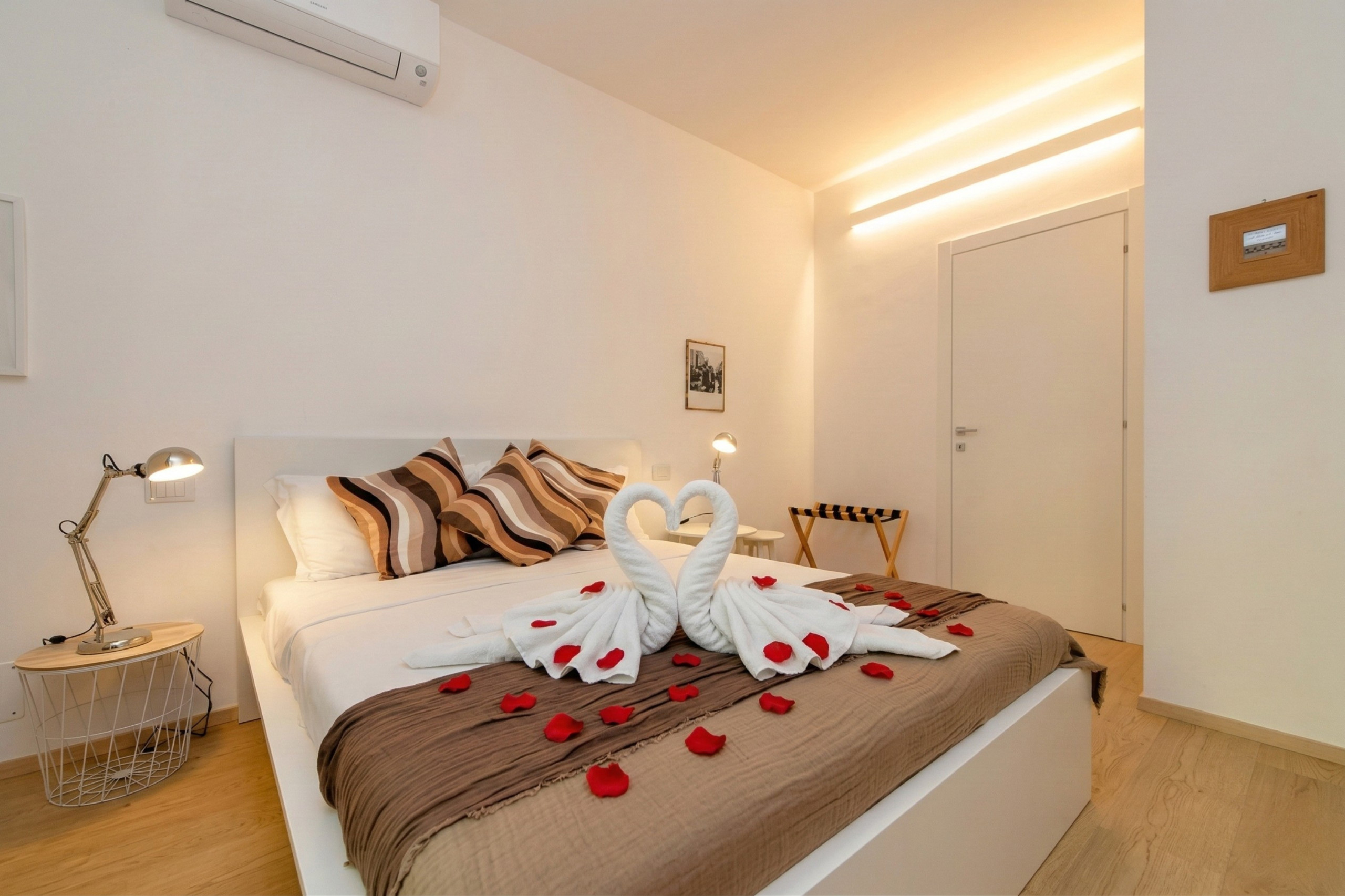 L’appartamento dispone di due eleganti camere matrimoniali, una delle quali impreziosita da una cabina armadio indipendente, di una camera con due letti singoli, di una camera con divano letto singolo e del divano letto matrimoniale nel soggiorno. Ogni camera è dotata di aria condizionata, TV a schermo piatto, oltre a un accesso diretto a un balcone privato, perfetto per godere di momenti di relax nella quiete e nell’intimità.
