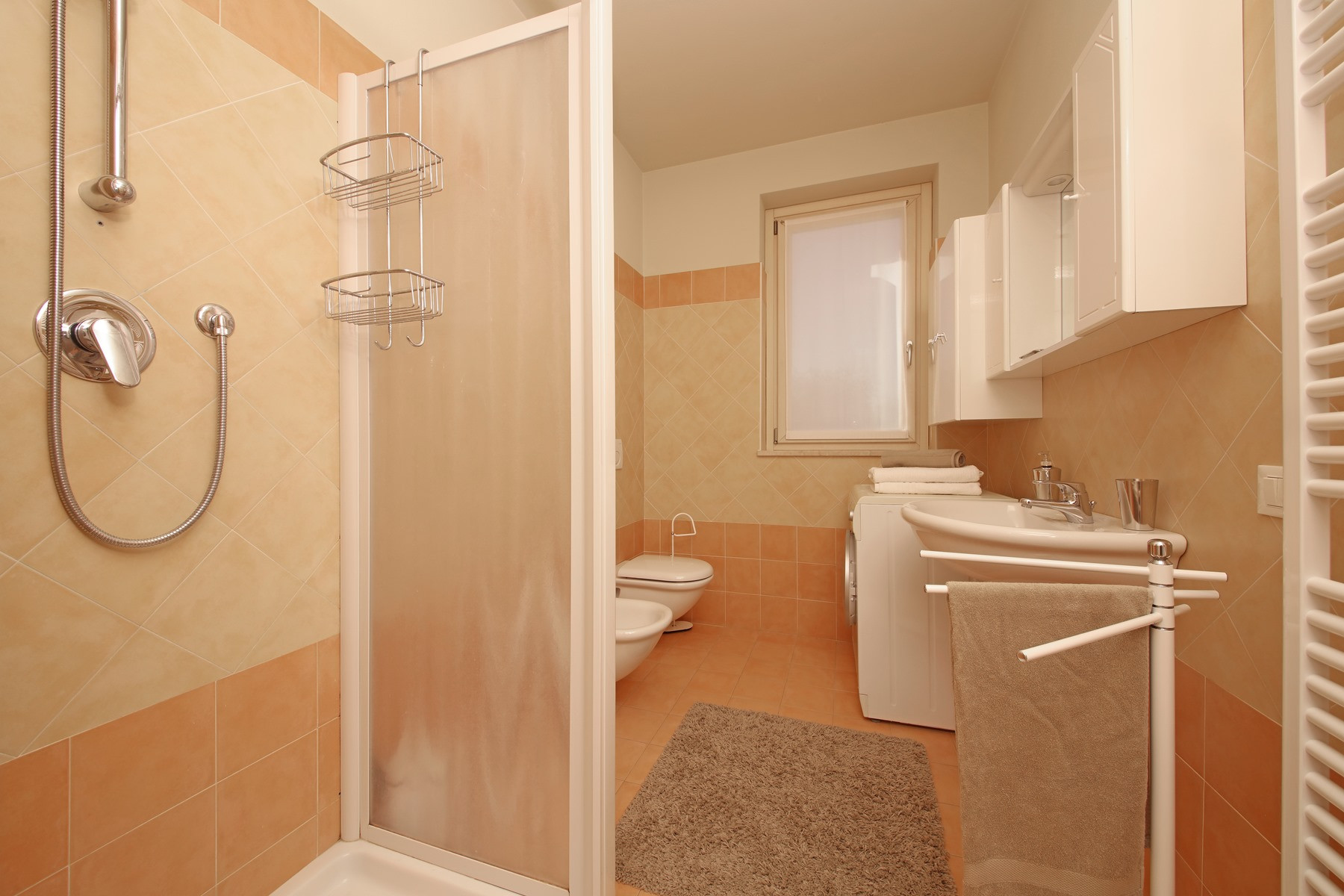 Attraverso un piccolo disimpegno con un armadio-specchio molto spazioso, (dotato di: asse da stiro, ferro da stiro e stendino) si raggiunge il bagno luminoso dotato di ampio lavabo con tanto spazio per riporre e ripiani, doccia, WC, bidet, specchio cosmetico con ingrandimento e asciugacapelli.