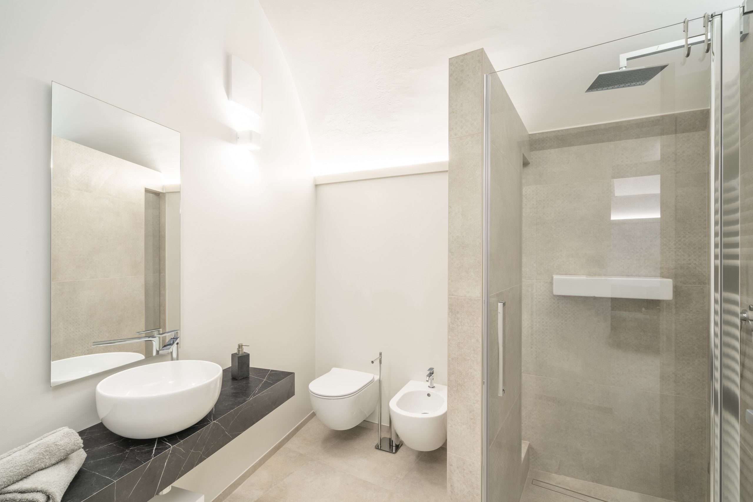 Completa l’appartamento un bagno elegante e funzionale, con ampia doccia pensata per momenti di puro benessere, e un pratico disbrigo lavanderia attrezzato, a disposizione degli ospiti.