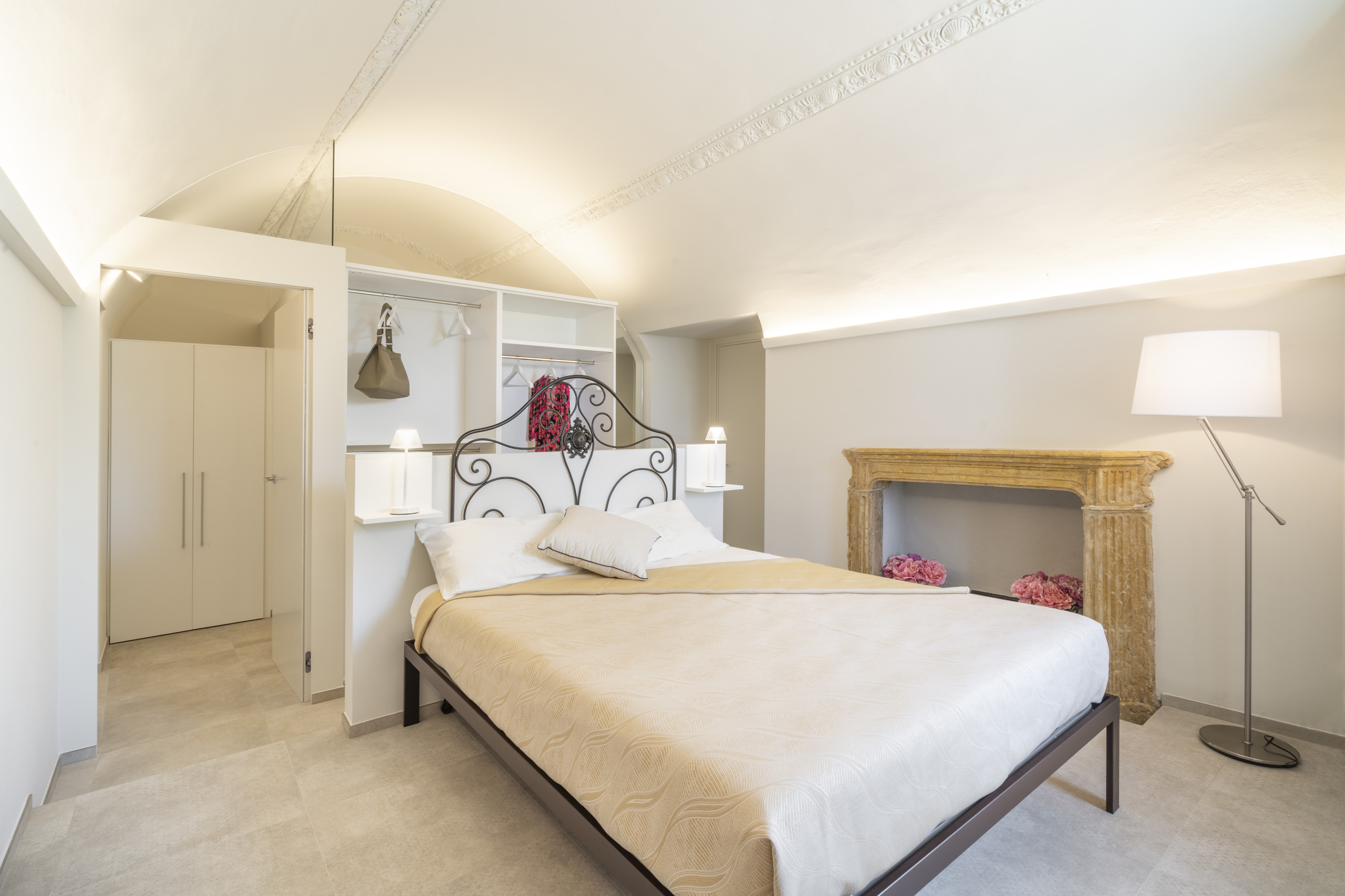 La camera matrimoniale è un vero rifugio romantico: l’antico caminetto in marmo giallo e le luci soffuse contribuiscono a creare un’atmosfera intima e avvolgente, ideale per il relax.