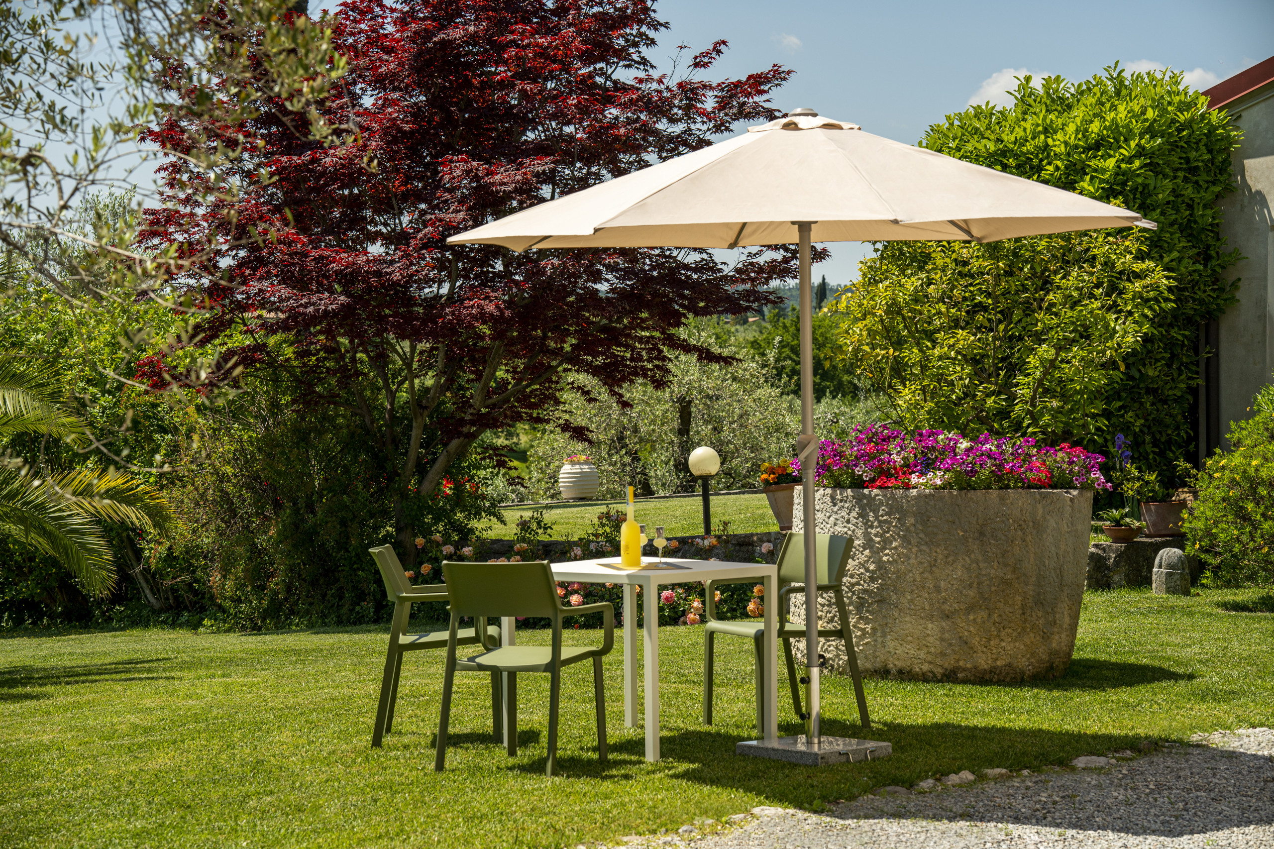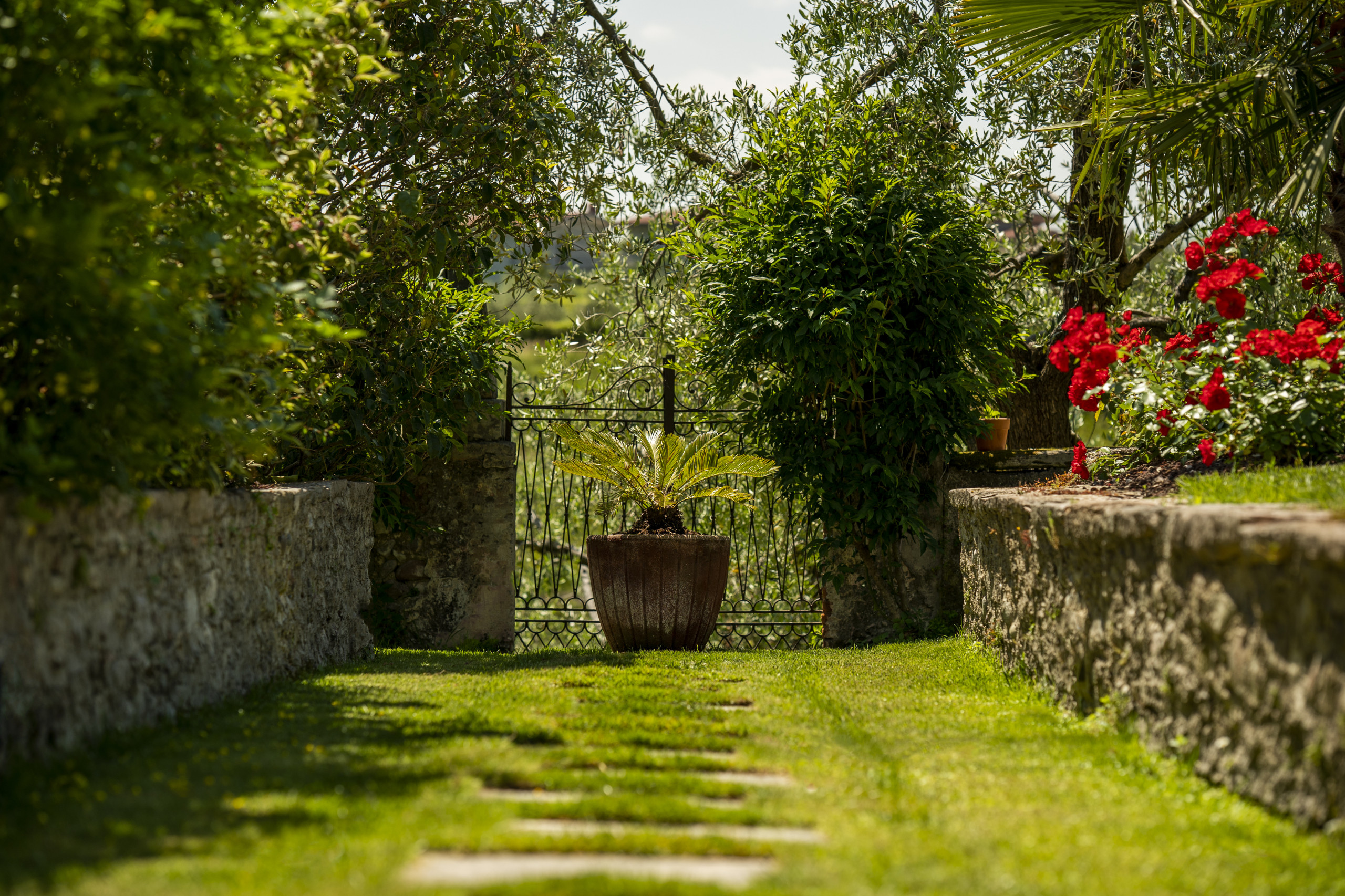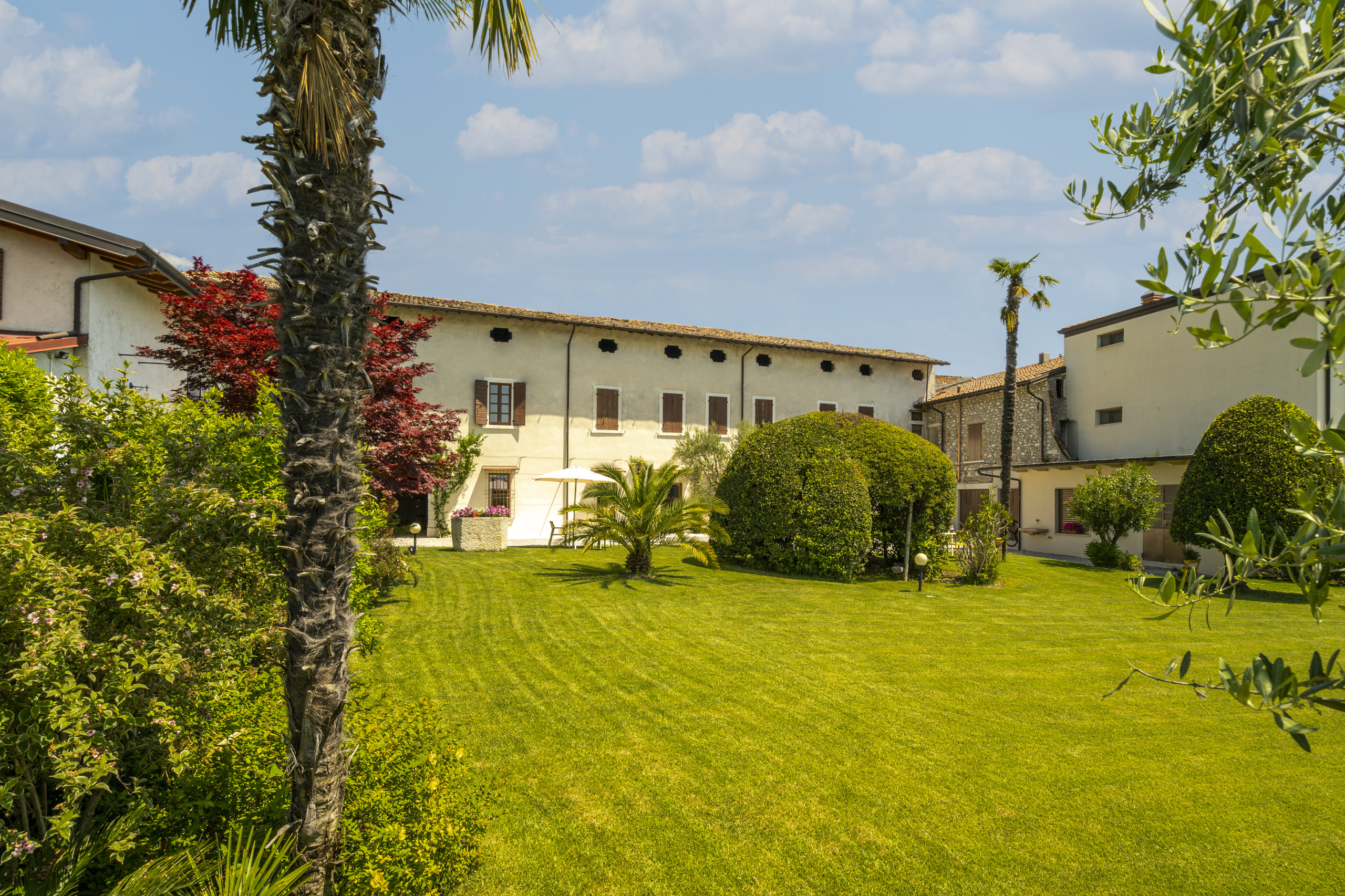 Il giardino del Palazzo, ampio e curato, è condiviso tra le tre residenze e invita a vivere gli spazi all’aperto in totale libertà. Gli ospiti possono passeggiare nel verde, pranzare o cenare sotto il gazebo comune, oppure concedersi momenti di maggiore riservatezza presso il tavolo all’aperto privato dedicato a ciascun appartamento. Completano l’esperienza i lettini prendisole, ideali per rilassarsi nella quiete e godere del sole del Lago di Garda.