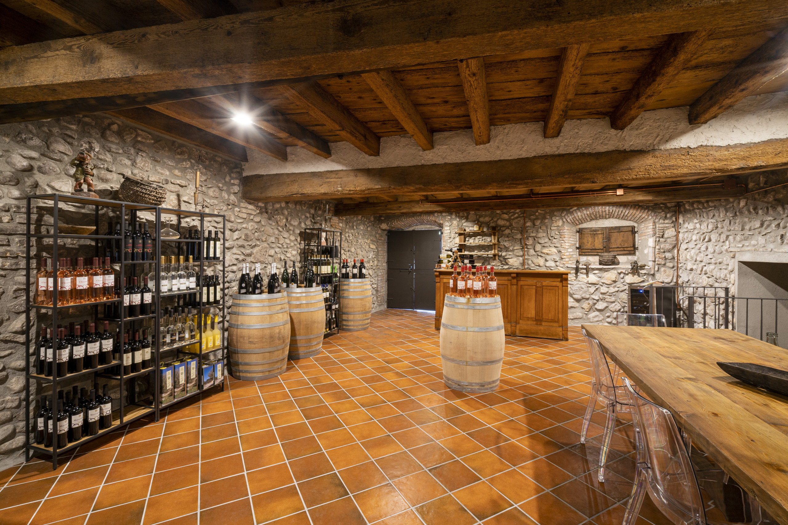 Adiacente agli appartamenti si trova la Cantina di famiglia, offrendo agli ospiti l’opportunità esclusiva di scoprire e acquistare la selezione di vini, olio extravergine e grappe della Tenuta, per portare con sé un’autentica espressione del territorio.