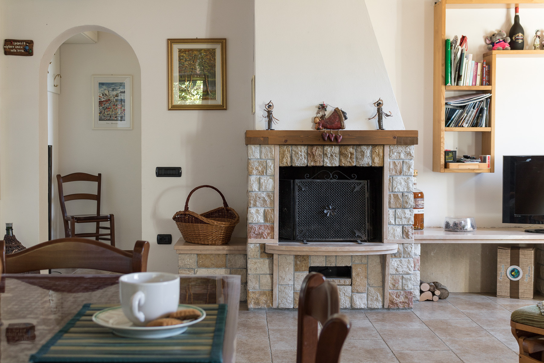 Il soggiorno è impreziosito da un camino realizzato in pietra locale, angolo ideale per ricreare atmosfere romantiche.