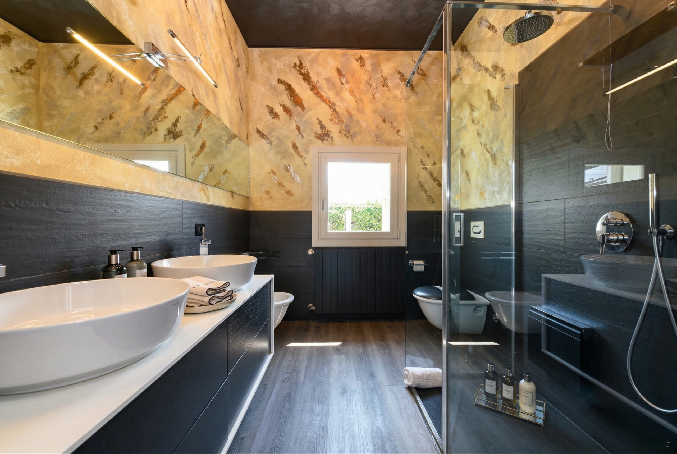 Salendo la suggestiva scalinata in cristallo, si accede alla zona notte, un rifugio di pace e comfort. La camera padronale, con il suo letto matrimoniale e un ampio guardaroba, è un piccolo angolo di paradiso, impreziosito da una finestra con vista sul lago. La seconda camera matrimoniale, altrettanto accogliente, offre una piacevole vista sul giardino e dispone di un ampio spazio per riporre gli effetti personali. Il bagno principale è elegante e funzionale, dotato di doppio lavabo, un’ampia doccia in vetro, wc e bidet. Ogni camera è dotata di aria condizionata e materassi con topper di alta qualità, un accorgimento che garantisce un riposo ancora più confortevole e rigenerante.