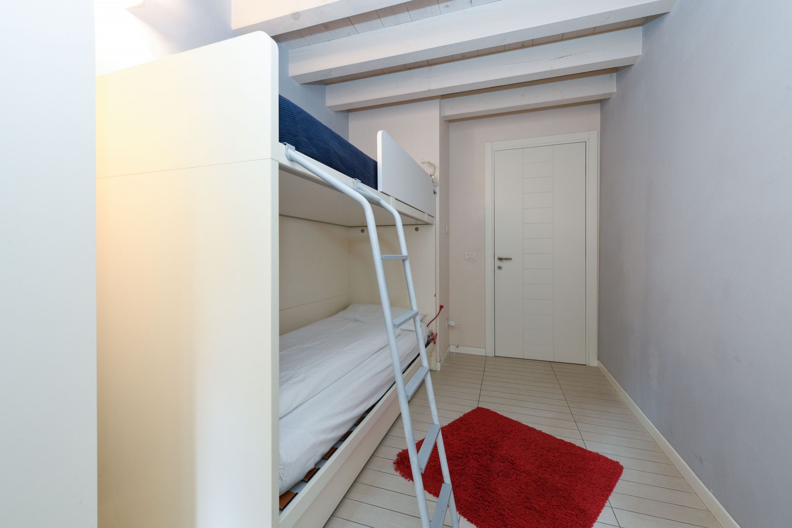 Al piano inferiore ci sono tre camere da letto, una con letto matrimoniale e una con letto a castello ed una con un letto matrimoniale ed un letto singolo a castello, il secondo bagno , una zona lavanderia e un accesso al giardino.