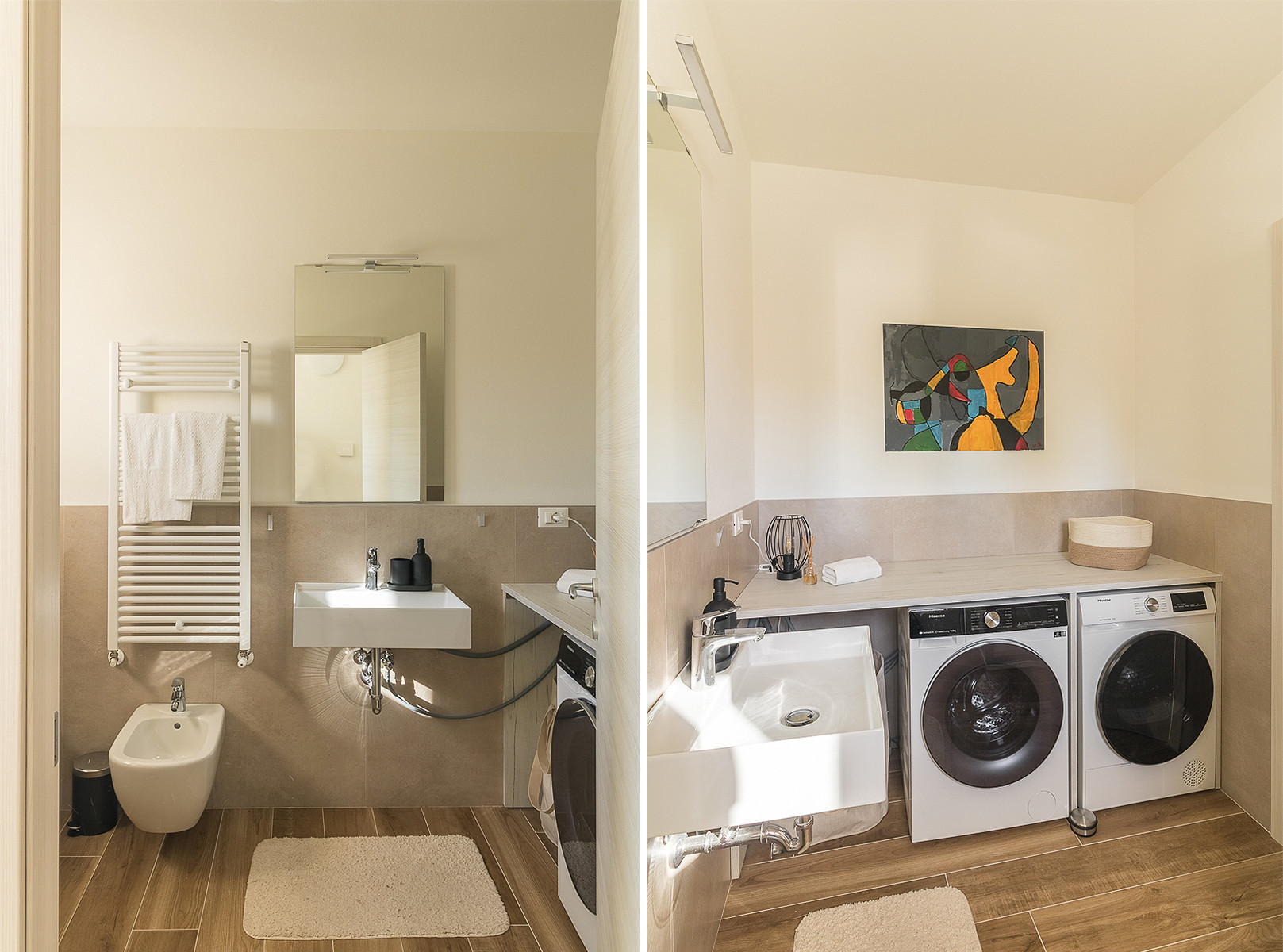 * Un elegante bagno moderno con doccia, bidet, lavatrice e asciugatrice.