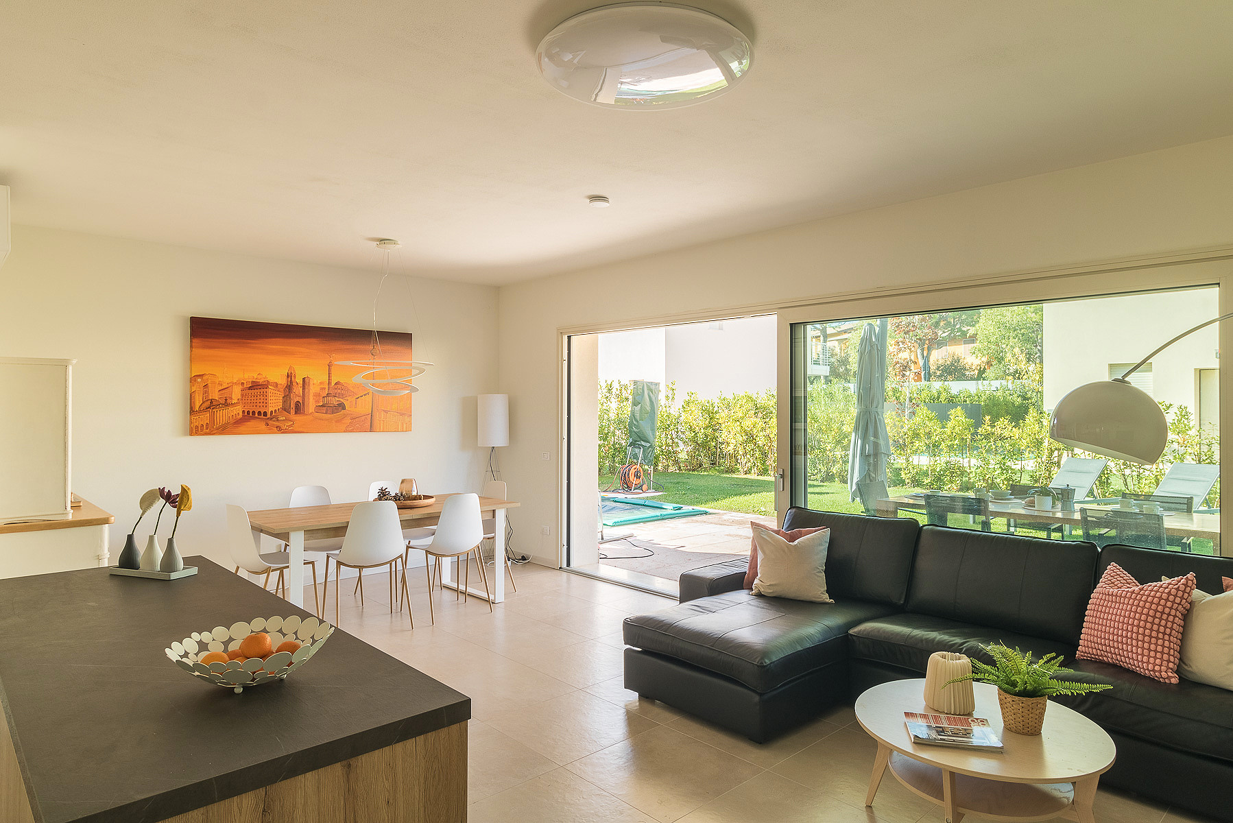 Dal soggiorno si accede ad una spaziosa terrazza coperta, attrezzata con mobili da esterno e il giardino privato con accesso alla grande piscina privata.