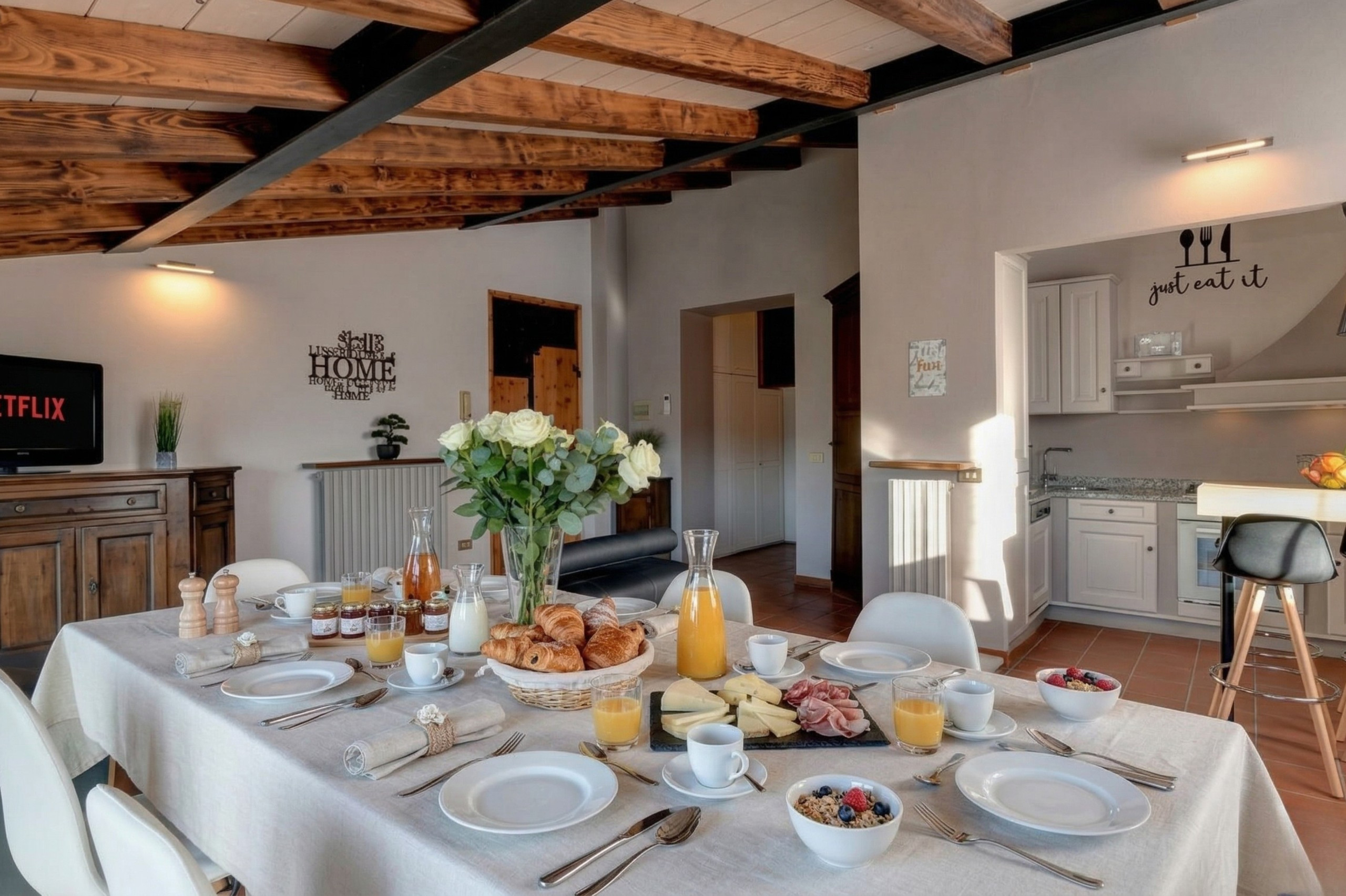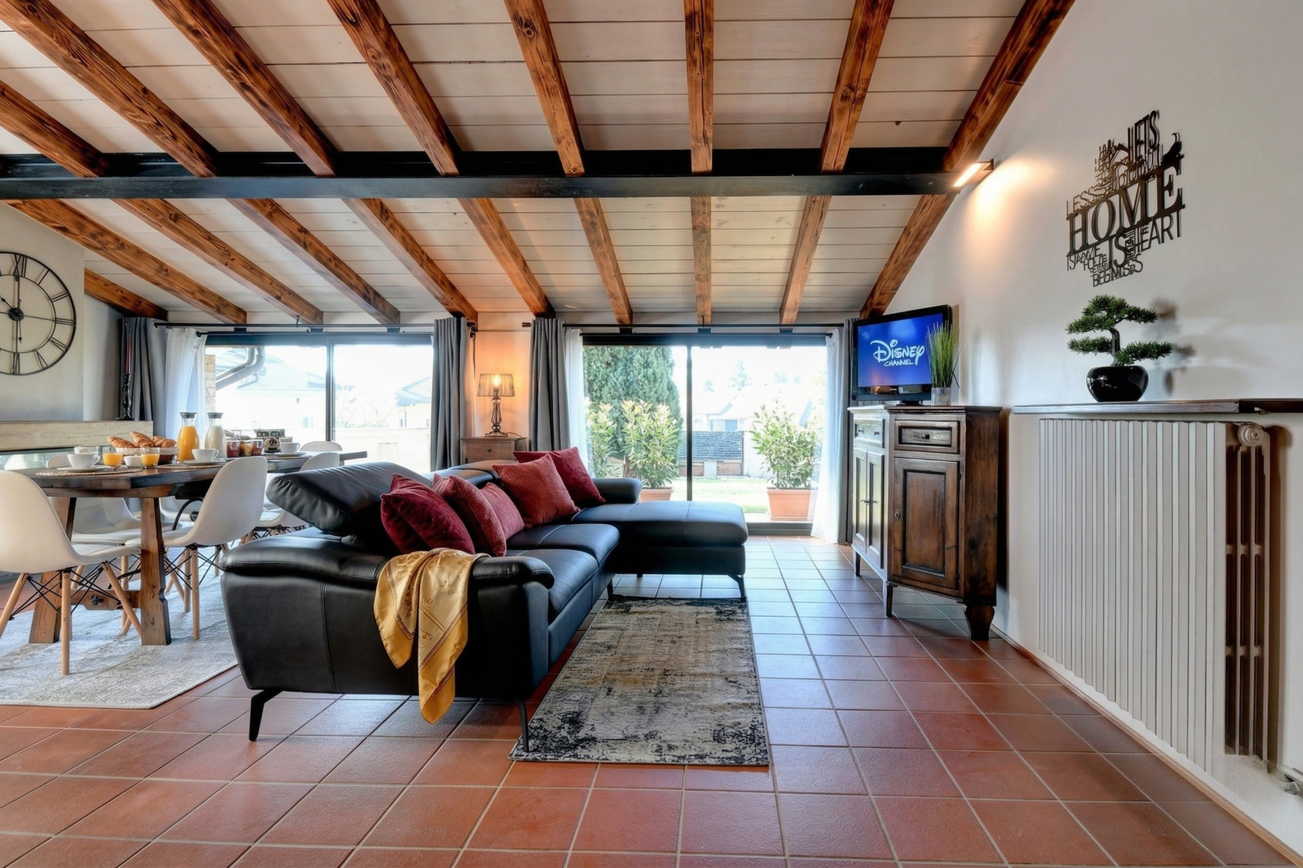 Der Eingang der Wohnung empfängt Sie in einer hellen und geräumigen Wohnzone, wo Funktionalität und Stil verschmelzen. Das Wohnzimmer ist mit einem bequemen Doppelbettsofa ausgestattet, perfekt für einen Moment der Entspannung nach einem Tag voller Erkundungen am See oder in den umliegenden Städten. Der Bereich verfügt über ein Flachbild-TV-Möbel, einen Tisch mit Stühlen für gesellige Mahlzeiten und eine vollständig ausgestattete Küche, ideal für diejenigen, die gerne ihre eigenen Gerichte zubereiten. Sie finden eine Kochplatte, Kühlschrank mit Gefrierfach, Mikrowelle, Toaster und alle notwendigen Utensilien, um mit Einfachheit und Geschmack zu kochen.