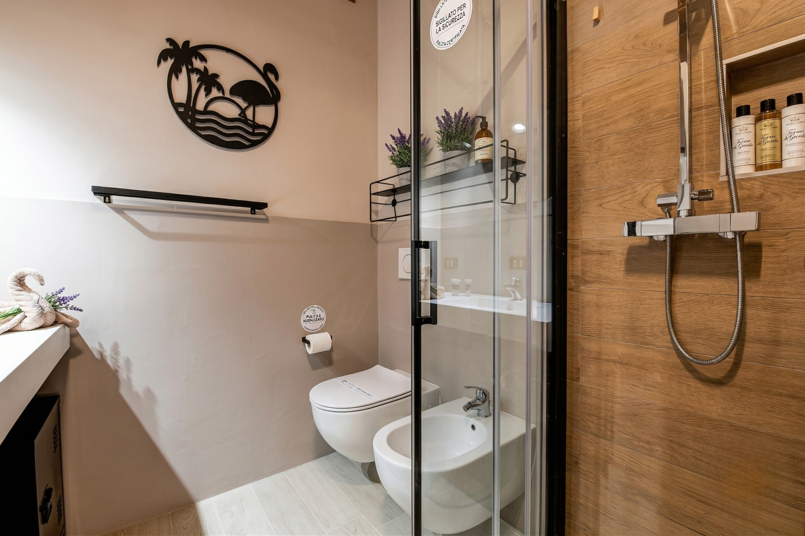 Der Schlafbereich, getrennt vom Wohnbereich, besteht aus einem großen und einladenden Doppelzimmer, ausgestattet mit einem großen Kleiderschrank, Nachttischen und einem Spiegel, der dem Raum Helligkeit verleiht. Das Badezimmer ist modern und funktional, mit einer geräumigen Dusche und einer Waschmaschine für mehr Komfort während des Aufenthalts.