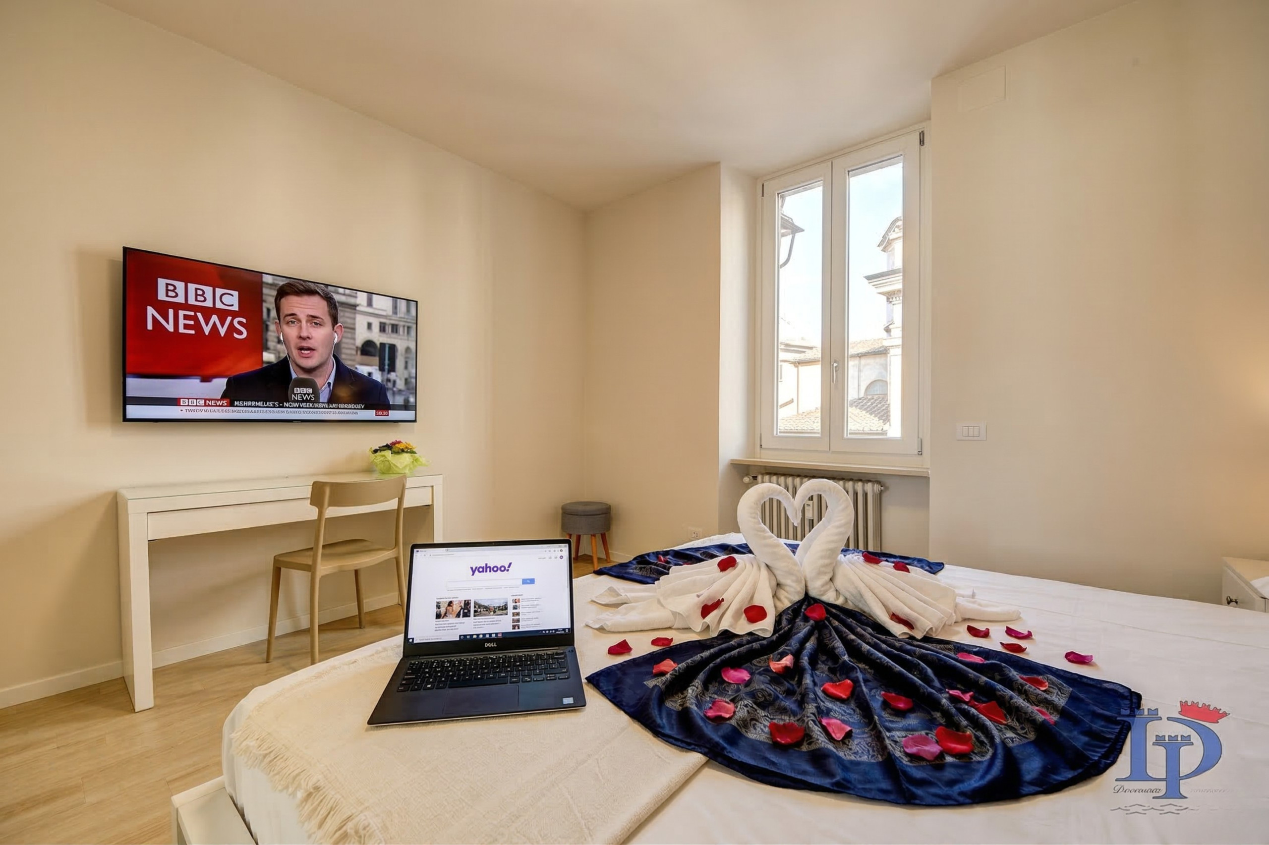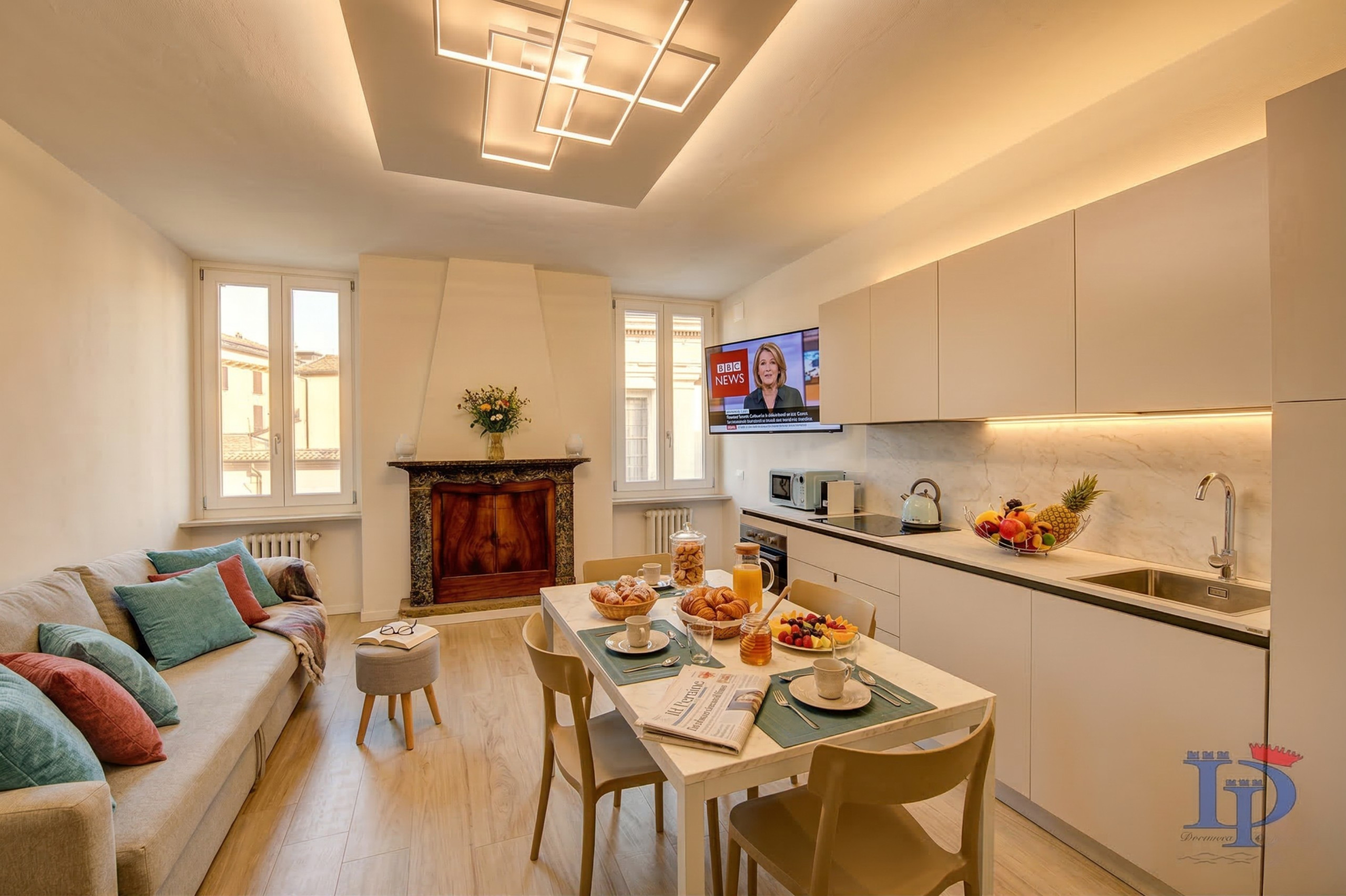 Der Schlafbereich ist eine Oase der Ruhe, die darauf ausgelegt ist, maximale Erholung und Privatsphäre zu gewährleisten. Das Schlafzimmer, geräumig und hell, ist mit einem sophistizierten und einladenden Stil eingerichtet, aufgewertet durch einen eleganten Kleiderschrank, einen Spiegel, einen 50-Zoll-Smart-TV und ein Fenster, das einen bezaubernden Blick auf den Dom bietet, eine der malerischsten Aussichten in Desenzano. Das Bett ist mit einem hochwertigen Topper ausgestattet, der darauf ausgelegt ist, ein außergewöhnliches Schleferlebnis zu bieten, mit einer ergonomischen Unterstützung, die den Körper sanft umhüllt und die Schlafqualität verbessert.