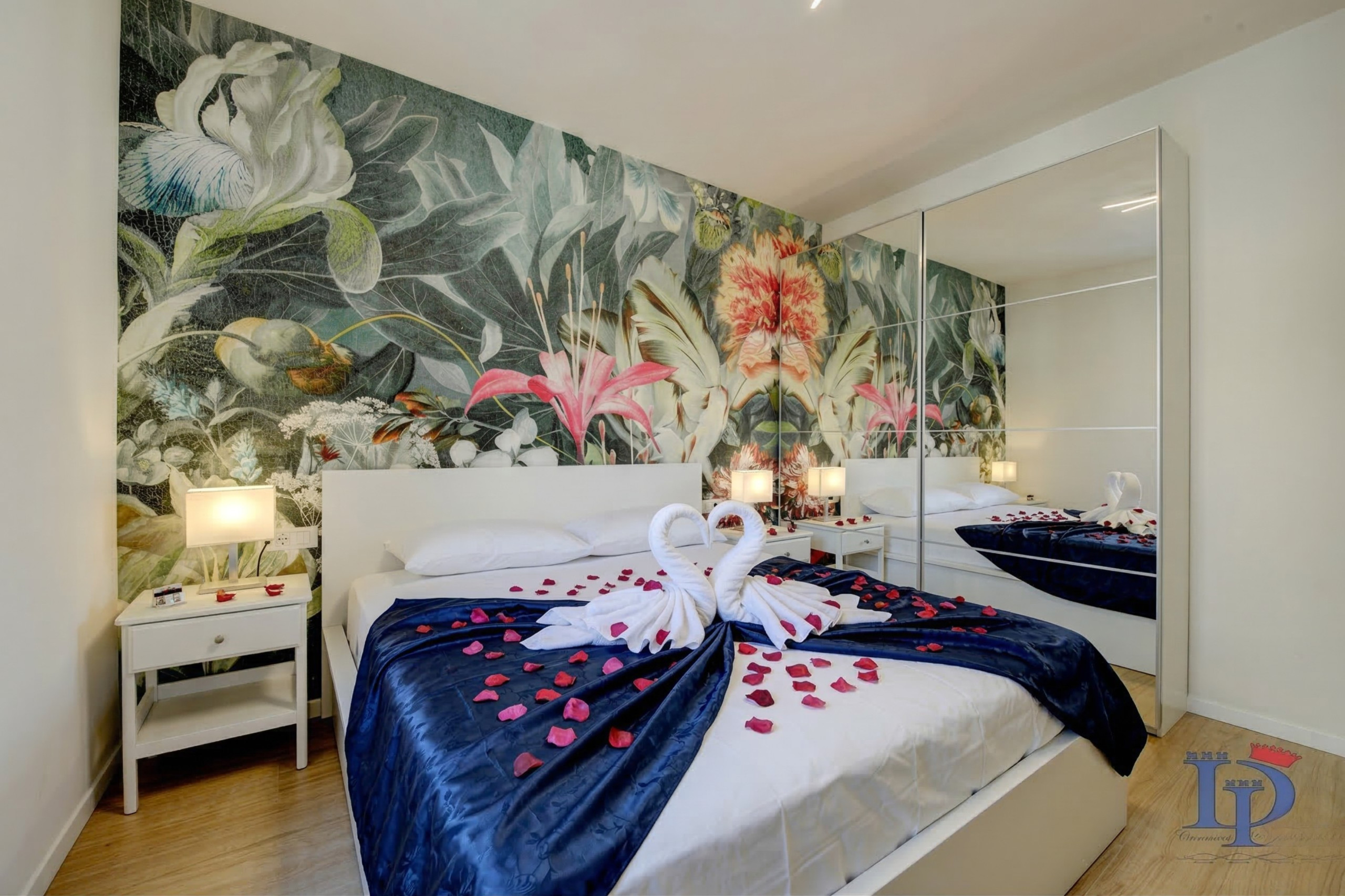 Zwischen den beiden Zimmern befindet sich ein modernes, geräumiges Badezimmer mit allen Annehmlichkeiten. Das raffinierte Design verbindet sich mit der Funktionalität einer XXL-Duschkabine, perfekt für einen Moment der Entspannung nach einem Tag voller Ausflüge oder Einkäufe. Das Badezimmer verfügt zudem über eine Toilette, ein geräumiges Waschbecken und einen Abstellraum, der Ordnung und Praktikabilität während des gesamten Aufenthalts gewährleistet.
