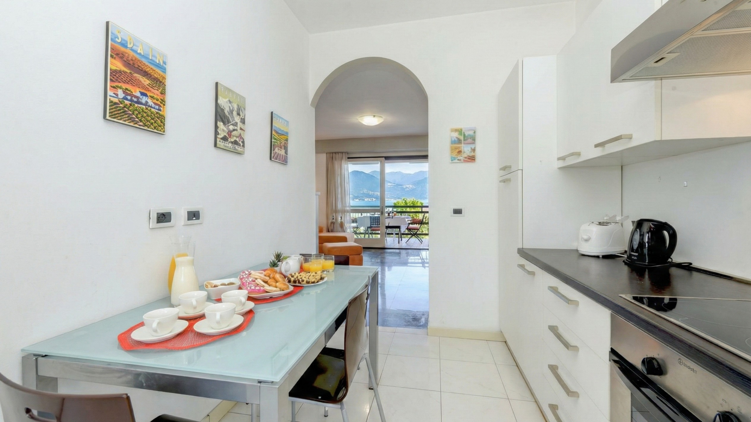 Der Eingang der Wohnung empfängt Sie in einer hellen und geräumigen Wohnzone, wo Funktionalität und Stil verschmelzen. Das Wohnzimmer ist mit einem bequemen Doppelbettsofa ausgestattet, perfekt für einen Moment der Entspannung nach einem Tag voller Erkundungen am See oder in den umliegenden Städten. Der Bereich verfügt über ein Flachbild-TV-Möbel, einen Tisch mit Stühlen für gesellige Mahlzeiten und eine vollständig ausgestattete Küche, ideal für diejenigen, die gerne ihre eigenen Gerichte zubereiten. Sie finden eine Kochplatte, Kühlschrank mit Gefrierfach, Mikrowelle, Toaster und alle notwendigen Utensilien, um mit Einfachheit und Geschmack zu kochen.