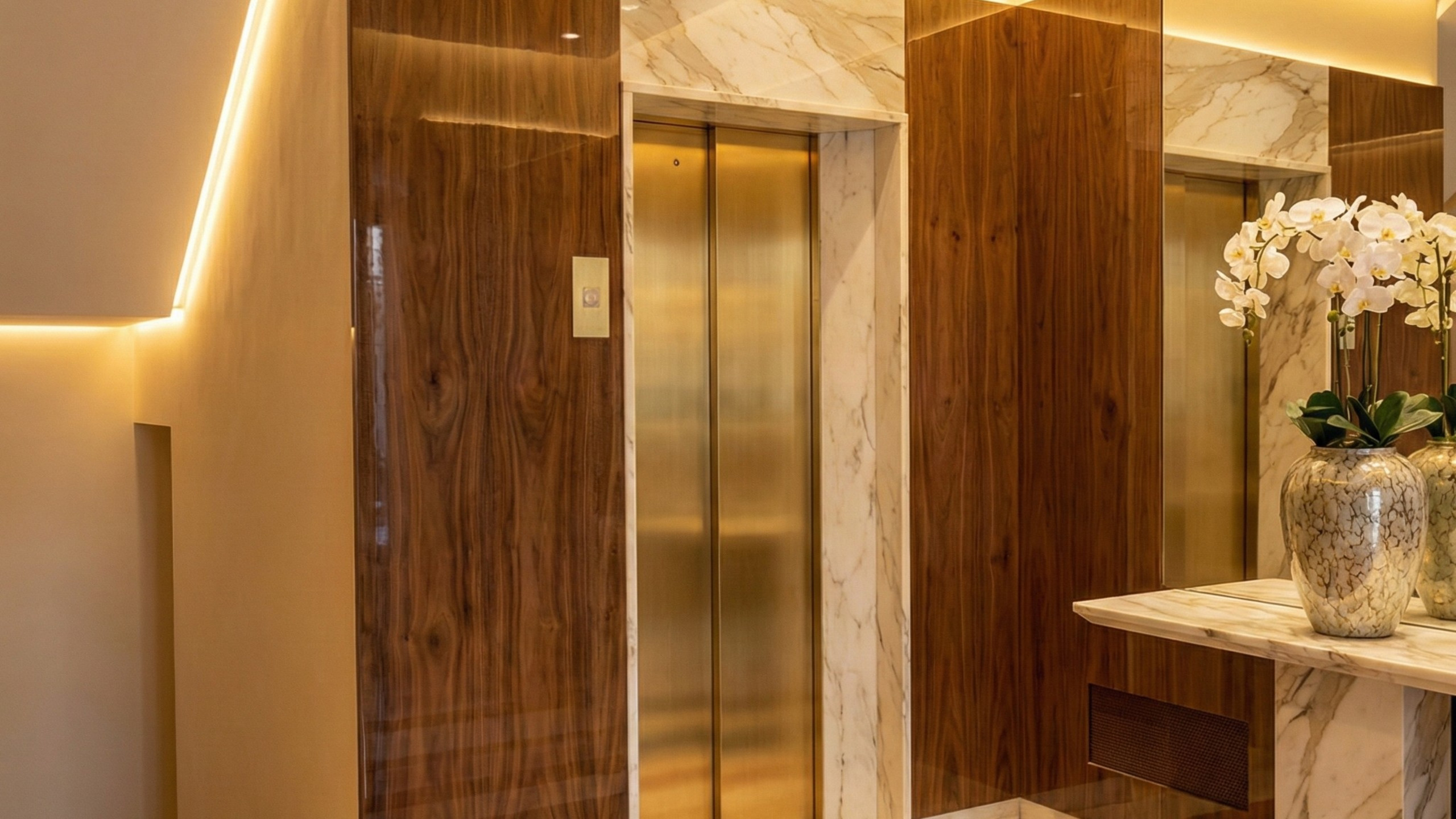 Beim Überschreiten der Schwelle manifestiert sich die Eleganz des Raumes sofort durch einen langen Flur, der mit beigen Marmorplatten verschönert ist und an dem Einrichtungselemente hängen, die den Charme der Vergangenheit erzählen: ein Vintage-Möbelstück aus dunklem Holz und ein wunderschöner venezianischer Spiegel, der das natürliche Licht reflektiert und eine warme, einladende Atmosphäre schafft.