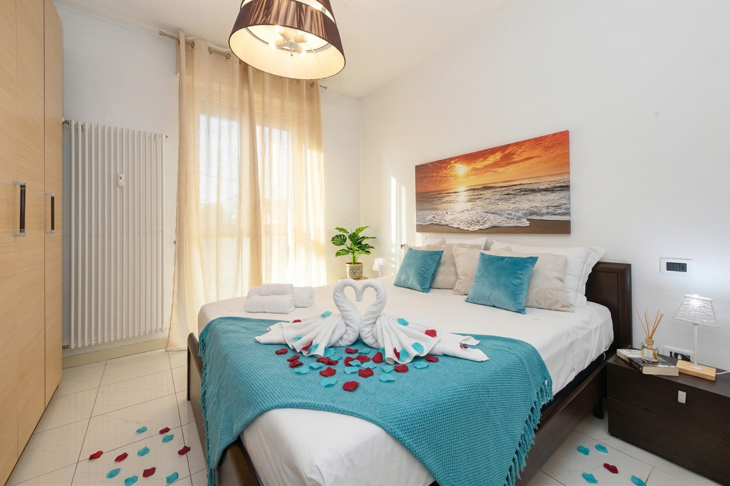 Der Schlafbereich entwickelt sich harmonisch entlang des Flurs. Das erste Doppelzimmer, rechts gelegen, ist eine Oase der Ruhe, wo eine große Balkontür das Morgenlicht und eine Atmosphäre der Gelassenheit hereinlässt. Das Bett, flankiert von diskreten Nachttischen, ist von einem großen Kleiderschrank mit vier Türen umrahmt, perfekt, um jedem Platzbedarf gerecht zu werden. Ein künstlerischer Akzent verschönert den Raum: eine Reproduktion von Van Goghs berühmter Sternennacht, die dem Zimmer eine entspannende und suggestive Atmosphäre verleiht.