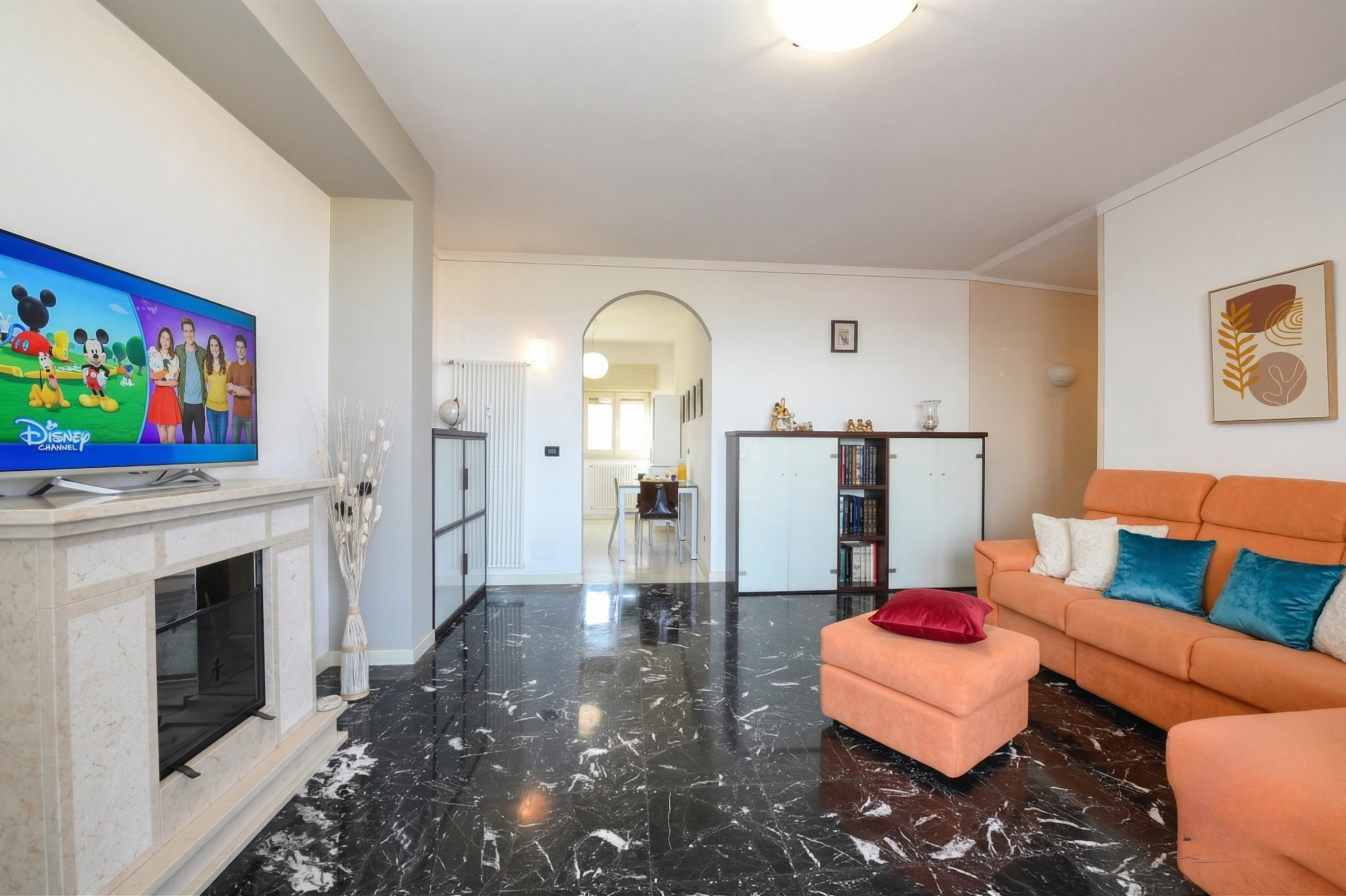 Das Herzstück der Wohnung ist das Wohnzimmer, ein lebendiger und ausgeklügelter Raum, in dem Eleganz mit Praktikabilität kombiniert wird. Der schwarz-weiße Marmorboden schafft einen raffinierten Kontrast zum großen orangefarbenen Sofa, das zum Entspannen und Verweilen einlädt. Weiche Kissen in Grau-, Weiß- und Blautönen bereichern den Raum, während ein raffinierter Glastisch einen Hauch von Klasse hinzufügt. Der SMART-TV mit Zugang zu Netflix und Amazon Prime ermöglicht Unterhaltung in vollkommenem Komfort. Der wahre Star dieses Raumes ist jedoch die spektakuläre Terrasse, die durch eine große Balkontür erreichbar