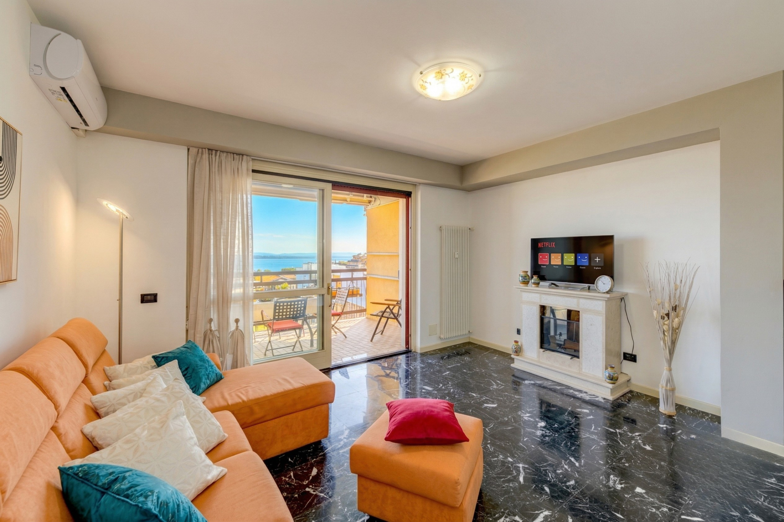 Im pulsierenden Herzen des historischen Zentrums von Desenzano del Garda, nur wenige Schritte vom Strand entfernt, befindet sich Ciao Lago, eine raffinierte Wohnung im vierten Stock eines ruhigen Mehrfamilienhauses mit Aufzug. Der Name selbst evoziert die Magie des Sees, die in all ihrer Schönheit von der herrlichen privaten Terrasse aus sichtbar wird, dem idealen Ort, um sich von atemberaubenden Sonnenuntergängen verzaubern zu lassen oder einfach die leichte Brise zu genießen, die das Wasser streichelt.