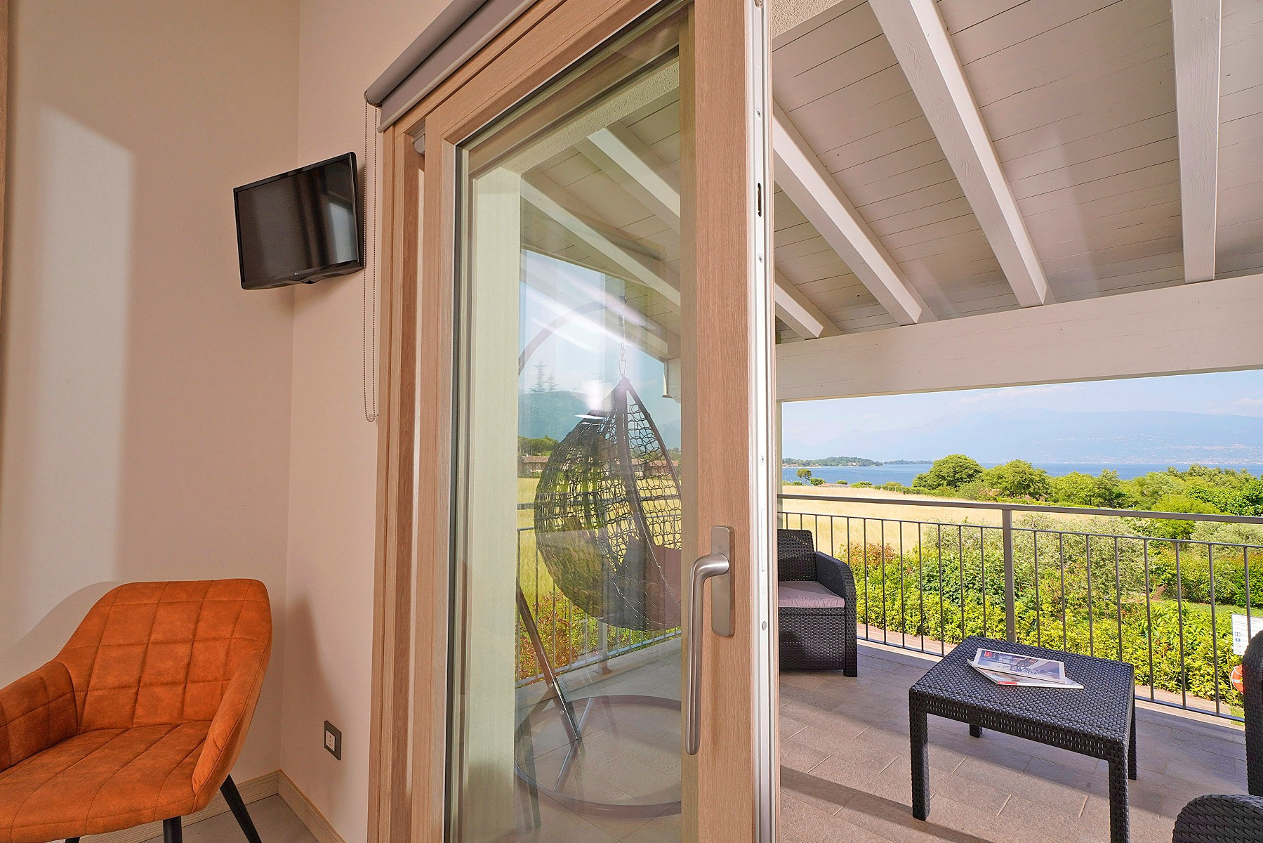 Der sehr schöne große Wohnbereich mit bequemer Doppelschlafcouch öffnet den Weg zum großen Balkon mit direktem Seeblick und Balkonmöbeln.