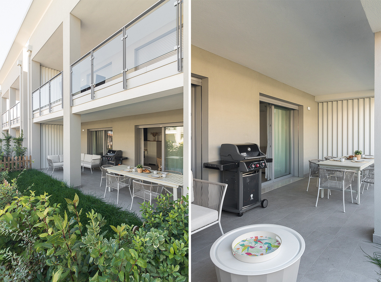Im Erdgeschoss verfügt das Apartment über eine großzügige überdachte Terrasse, ausgestattet mit Esstisch und gemütlicher Lounge-Ecke mit Sofas – der perfekte Ort für Mahlzeiten im Freien oder entspannte Momente mit Blick auf den charmanten privaten Garten.