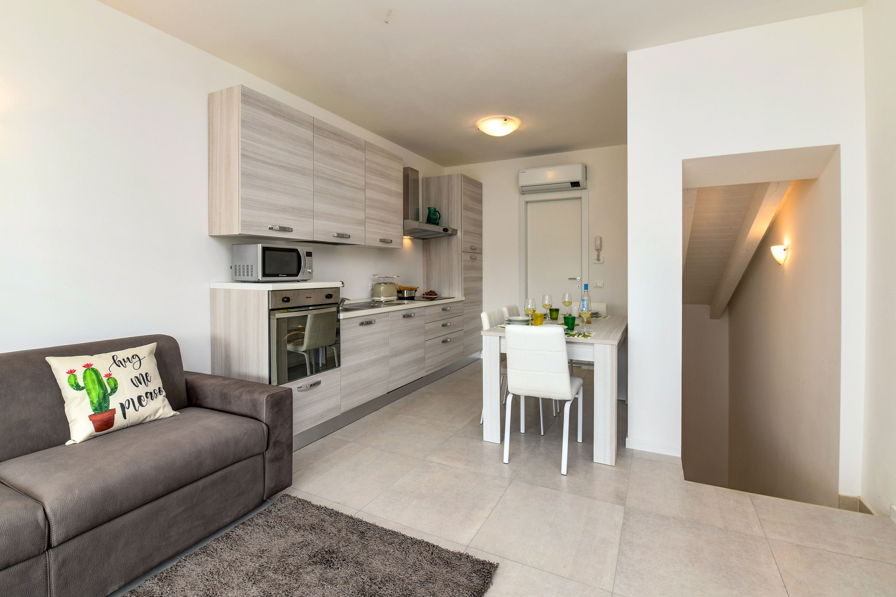Die Wohnung verfügt über einen überdachten privaten Balkon: hier lassen die Feriengäste den Tag entspannt mit einer Tasse Kaffee oder einer Espresso mit Nespresso-Kaffeemaschine gemacht beginnen oder abends bei einem Glas Rotwein passieren, Gartenmöbel sind vorhanden.