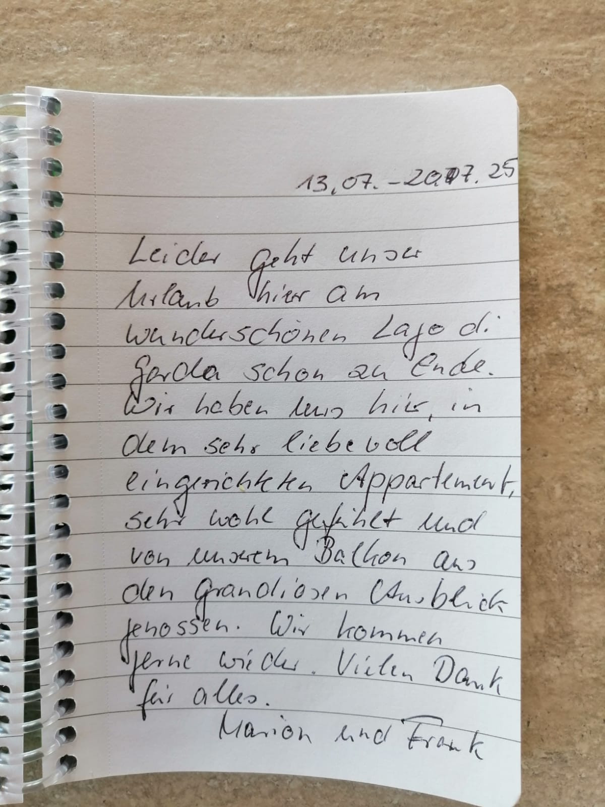 Die Wohnung ist sauber, hübsch eingerichtet und toll gelegen mit einem wunderbaren Blick auf den Gardasee. Der Garten ist liebevoll gestaltet und wir konnten uns hier richtig entspannen. Die Vermieter sind sehr freundlich, wie überhaupt alle Menschen, denen wir im Dorf und Umgebung begegnet sind. Eine klare Empfehlung für diese Unterkunft! |