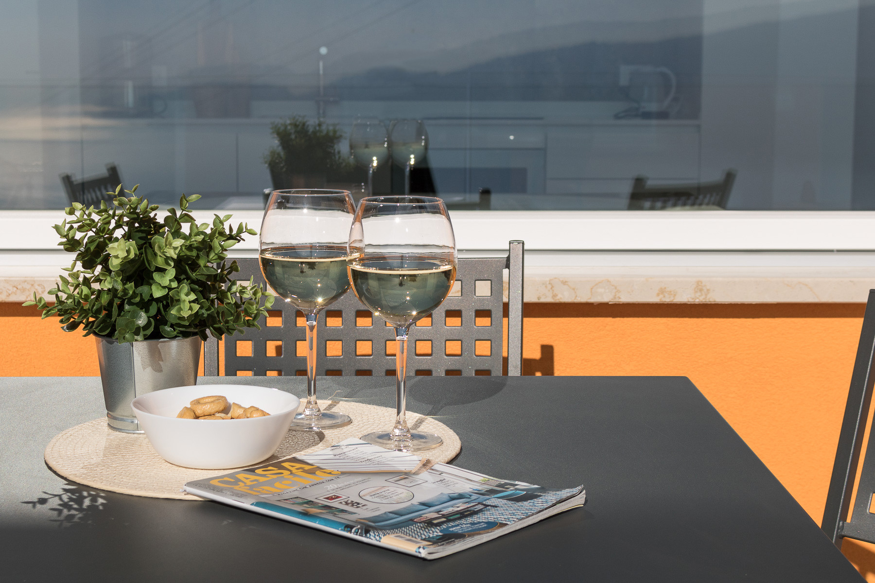 Vom Wohnzimmer hat man direkten Zutritt zur privaten Terrasse mit phantastischem Seeblick, wo man seine Mahlzeiten in einer Traumkulisse einnehmen kann.